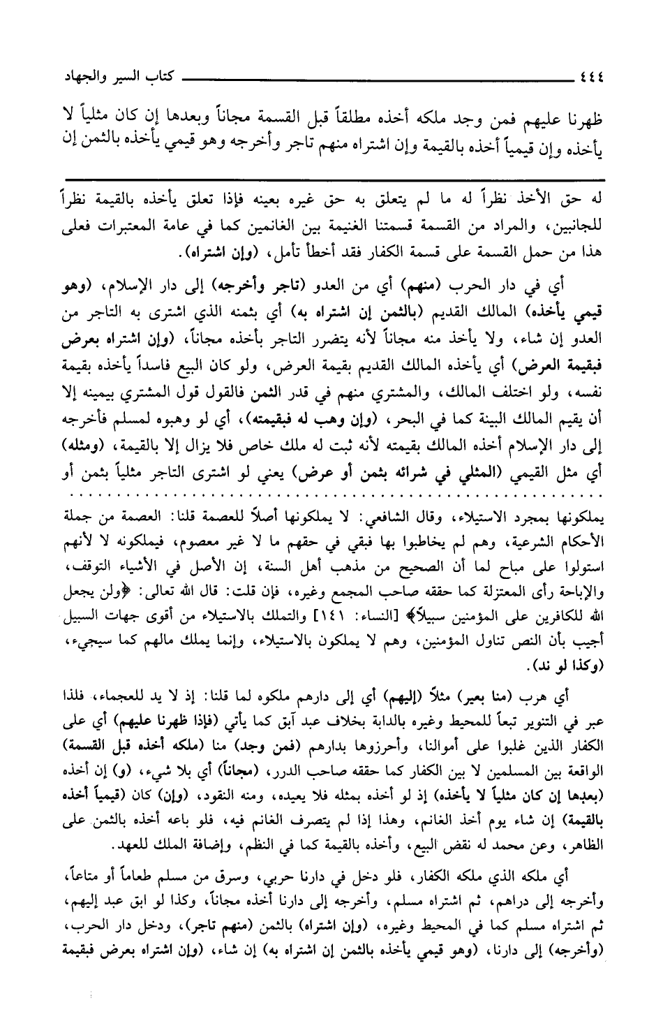 له حق الأخذ نظرا له ما لم يتعلق به حق غيره بعينه فإذا تعلق يأخذه بالقيمة نظرا للجانبين والمراد من القسمة قسمتنا الغنيمة بين الغانمين كما في عامة المعتبرات فعلى هذا من حمل القسمة على قسمة الكفار فقد أخطأ تأمل