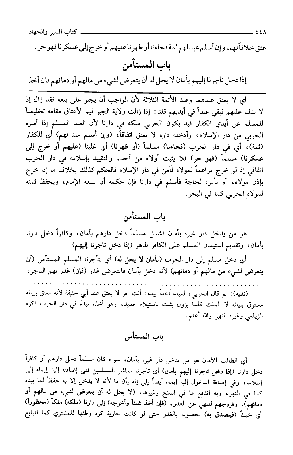 هو من يدخل دار غيره بأمان فشمل مسلما دخل دارهم بأمان وكافرا دخل دارنا بأمان وتقديم استيمان المسلم على الكافر ظاهر إذا دخل تاجرنا إليهم أي دخل مسلم إلى دار الحرب بأمان لا يحل له أي لتاجرنا المسلم المستأمن أن يتعرض لشيء من مالهم أو دمائهم لأنه دخل بأمان فالتعرض غدر فإن غدر بهم التاجر