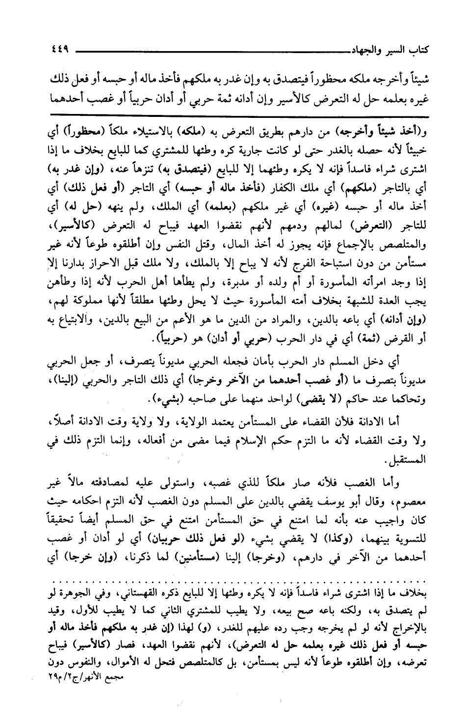 وإن غدر به أي بالتاجر ملكهم أي ملك الكفار فأخذ ماله أو حبسه أي التاجر أو فعل ذلك أي أخذ ماله أو حبسه غيره أي غير ملكهم بعلمه أي الملك ولم ينهه حل له أي للتاجر التعرض لمالهم ودمهم لأنهم نقضوا العهد فيباح له التعرض كالأسير والمتلصص بالإجماع فإنه يجوز له أخذ المال وقتل النفس وإن أطلقوه طوعا لأنه غير مستأمن دون استباحة الفرج لأنه لا يباح إلا بالملك ولا ملك قبل الإحراز بدارنا إلا إذا وجد امرأته المأسورة أو أم ولده أو مدبرة ولم يطأها أهل الحرب لأنه إذا وطئهن يجب العدة للشبهة بخلاف أمته المأسورة حيث لا يحل وطؤها مطلقا لأنها مملوكة لهم