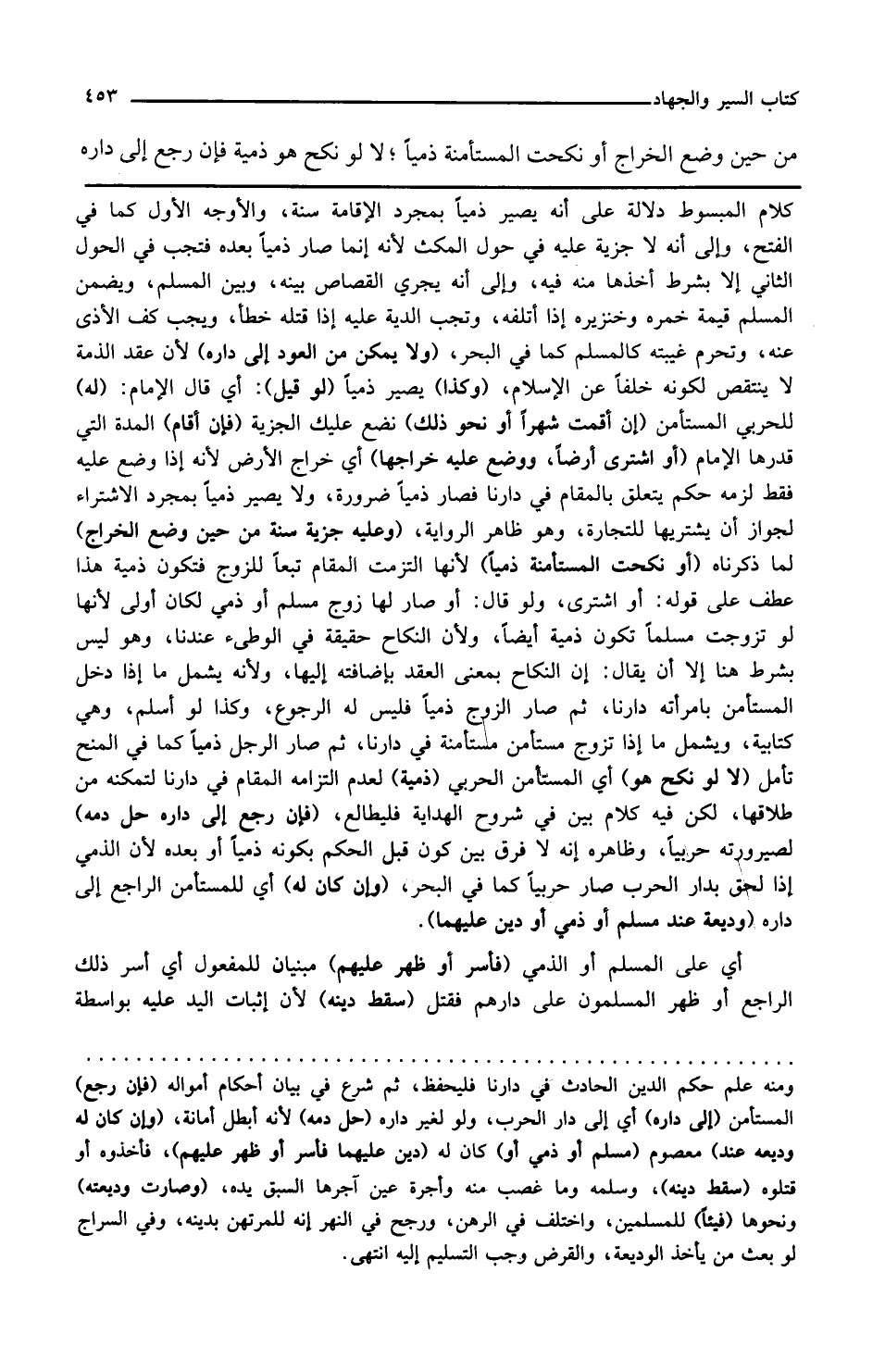 لا لو نكح هو أي المستأمن الحربي ذمية لعدم التزامه المقام في دارنا لتمكنه من طلاقها لكن فيه كلام بين في شروح الهداية فليطالع فإن رجع إلى داره حل دمه لصيرورته حربيا وظاهره أنه لا فرق بين كونه قبل الحكم بكونه ذميا أو بعده لأن الذمي إذا لحق بدار الحرب صار حربيا كما في البحر
