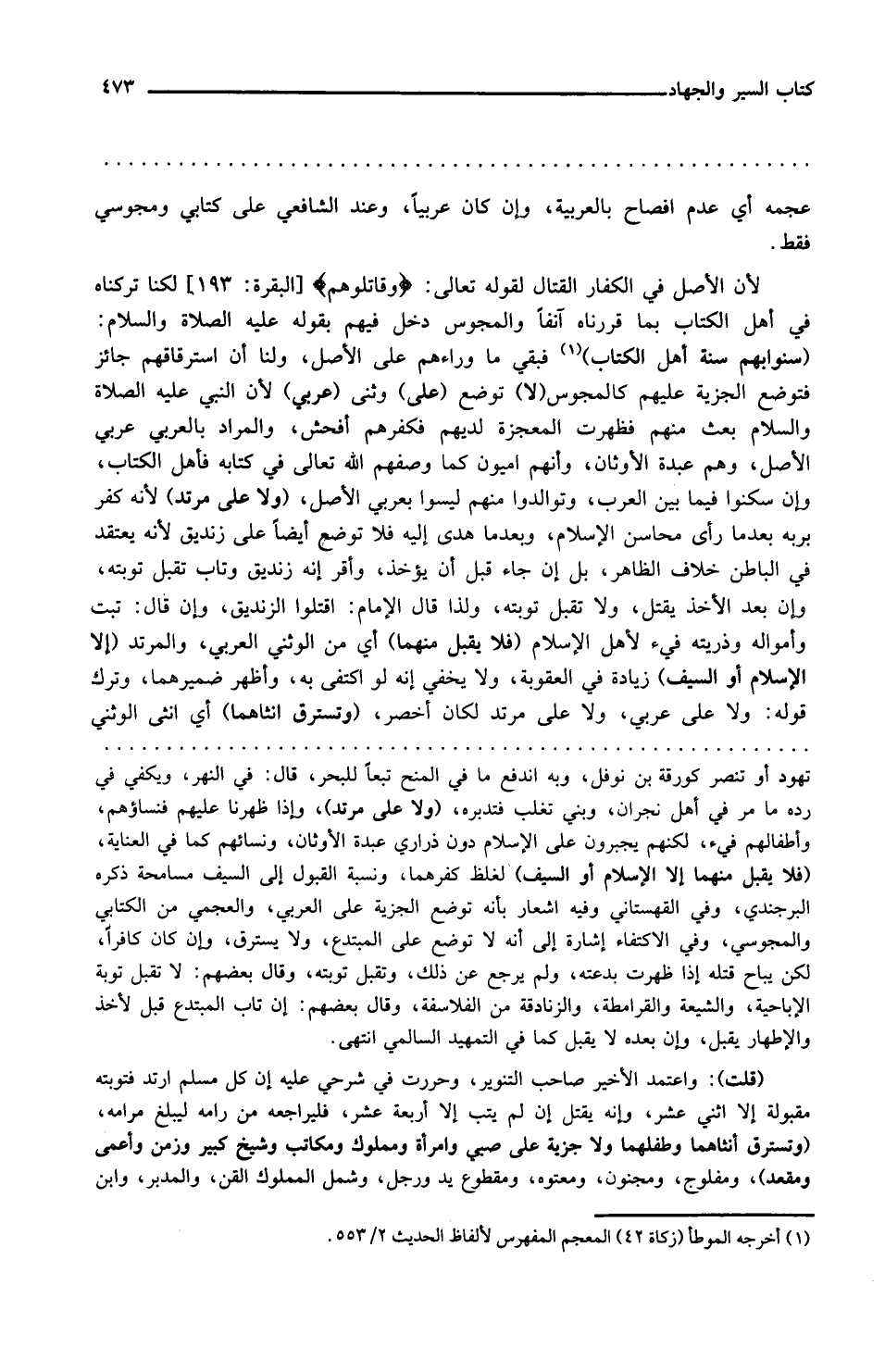 عجمة أي عدم إفصاح بالعربية وإن كان عربيا وعند الشافعي على كتابي ومجوسي فقط لأن الأصل في الكفار القتال لقوله تعالى وقاتلوهم لكنا تركناه في أهل الكتاب بما قررناه آنفا والمجوسي دخل فيهم بقوله عليه الصلاة والسلام سنوا بهم سنة أهل الكتاب فبقي ما وراءهم على الأصل ولنا أن استرقاقهم جائز فتوضع الجزية عليهم كالمجوس لا توضع على وثني عربي لأن النبي عليه الصلاة والسلام بعث منهم فظهرت المعجزة لديهم فكفرهم أفحش والمراد بالعربي عربي الأصل وهم عبدة الأوثان وإنهم أميون كما وصفهم الله تعالى في كتابه فأهل الكتاب وإن سكنوا فيما بين العرب وتوالدوا منهم ليسوا بعربي الأصل ولا على مرتد لأنه كفر بربه بعدما رأى محاسن الإسلام وبعدما هدي إليه فلا توضع أيضا على زنديق لأنه يعتقد في الباطن خلاف الظاهر بل إن جاء قبل أن يؤخذ وأقر أنه زنديق وتاب تقبل توبته وإن بعد الأخذ يقتل ولا تقبل توبته ولذا قال الإمام اقتلوا الزنديق وإن قال تبت وأمواله وذريته فيء لأهل الإسلام فلا يقبل منهما أي من الوثني العربي والمرتد إلا الإسلام أو السيف زيادة في العقوبة ولا يخفى أنه لو اكتفى به وأظهر ضميرهما وترك قوله ولا على عربي ولا على مرتد لكان أخصر وتسترق أنثاهما أي أنثى الوثني