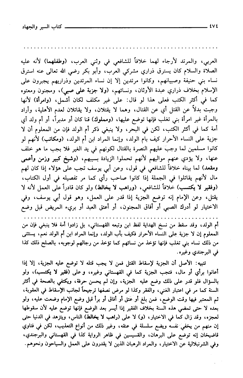 العربي والمرتد لا رجاء لهما خلافا للشافعي في وثني العرب وطفلهما لأنه عليه الصلاة والسلام كان يسترق ذراري مشركي العرب وأبو بكر رضي الله تعالى عنه استرق نساء بني حنيفة وصبيانهم وكانوا مرتدين إلا أن نساء المرتدين وذراريهم يجبرون على الإسلام بخلاف ذراري عبدة الأوثان ونسائهم ولا جزية على صبي ومجنون ومعتوه كما في أكثر الكتب فعلى هذا لو قال على غير مكلف لكان أشمل وامرأة لأنها وجبت بدلا عن القتل أي عن القتال وهما لا يقتلان ولا يقاتلان لعدم الأهلية وأراد بالمرأة غير امرأة بني تغلب فإنها توضع عليها ومملوك قنا كان أو مدبرا أو أم ولد أي أمة كما في أكثر الكتب لكن في البحر ولا ينبغي ذكر أم الولد فإن من المعلوم أن لا جزية على النساء الأحرار فكيف بأم الولد وإنما المراد ابن أم الولد ومكاتب لأنهم لو كانوا مسلمين لما وجب عليهم النصرة بالقتال لكونهم في يد الغير فلا يجب ما هو خلاف عنها ولا يؤدي عنهم مواليهم لأنهم تحملوا الزيادة بسببهم وشيخ كبير وزمن وأعمى ومقعد لما بيناه خلافا للشافعي في قول وعن أبي يوسف تجب على هؤلاء إذا كان لهم مال لأنهم يقاتلون في الجملة إذا كانوا صاحبي رأي كما مر تفصيله في أول الكتاب وفقير لا يكتسب خلافا للشافعي وراهب لا يخالط ولو كان قادرا على العمل لأنه لا يقتل وعن الإمام أنه توضع الجزية إذا قدر على العمل وهو قول أبي يوسف وفي الاختيار لو أدرك الصبي أو أفاق المجنون أو أعتق العبد أو برئ المريض قبل وضع