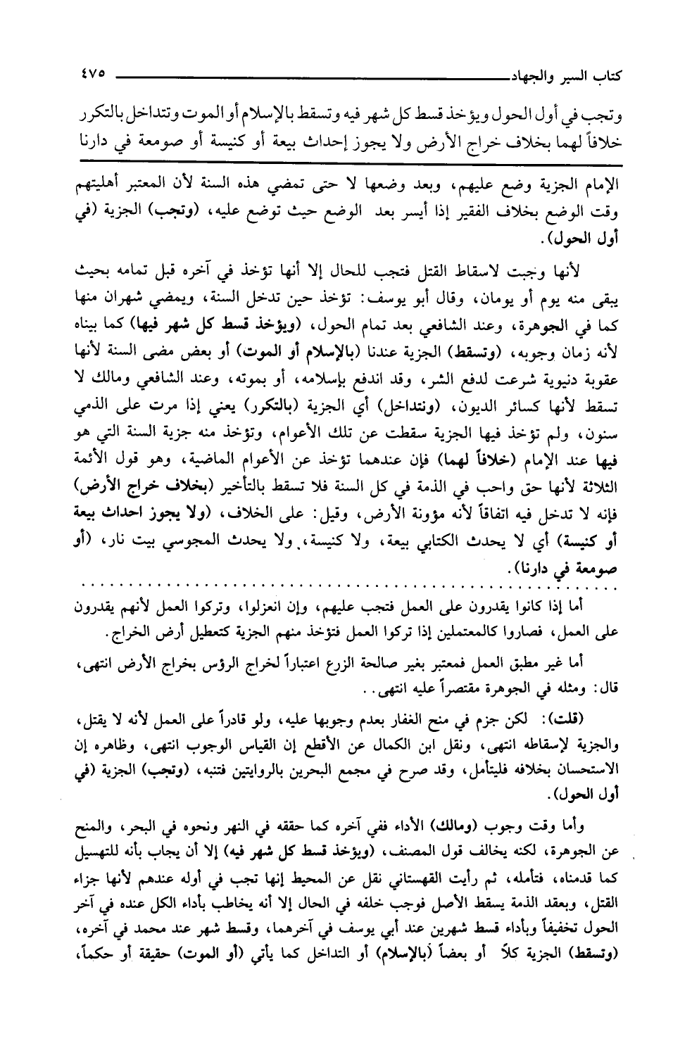 وتسقط الجزية عندنا بالإسلام أو الموت أو بعد مضي السنة لأنها عقوبة دنيوية شرعت لدفع الشر وقد اندفع بإسلامه أو بموته وعند الشافعي ومالك لا تسقط لأنها كسائر الديون وتتداخل أي الجزية بالتكرر يعني إذا مرت على الذمي سنون ولم تؤخذ فيها الجزية سقطت عن تلك الأعوام وتؤخذ منه جزية السنة التي هو فيها عند الإمام خلافا لهما فإن عندهما تؤخذ عن الأعوام الماضية وهو قول الأئمة الثلاثة لأنها حق واجب في الذمة في كل السنة فلا تسقط بالتأخير بخلاف خراج الأرض فإنه لا تدخل فيه اتفاقا لأنه مؤنة الأرض وقيل على الخلاف