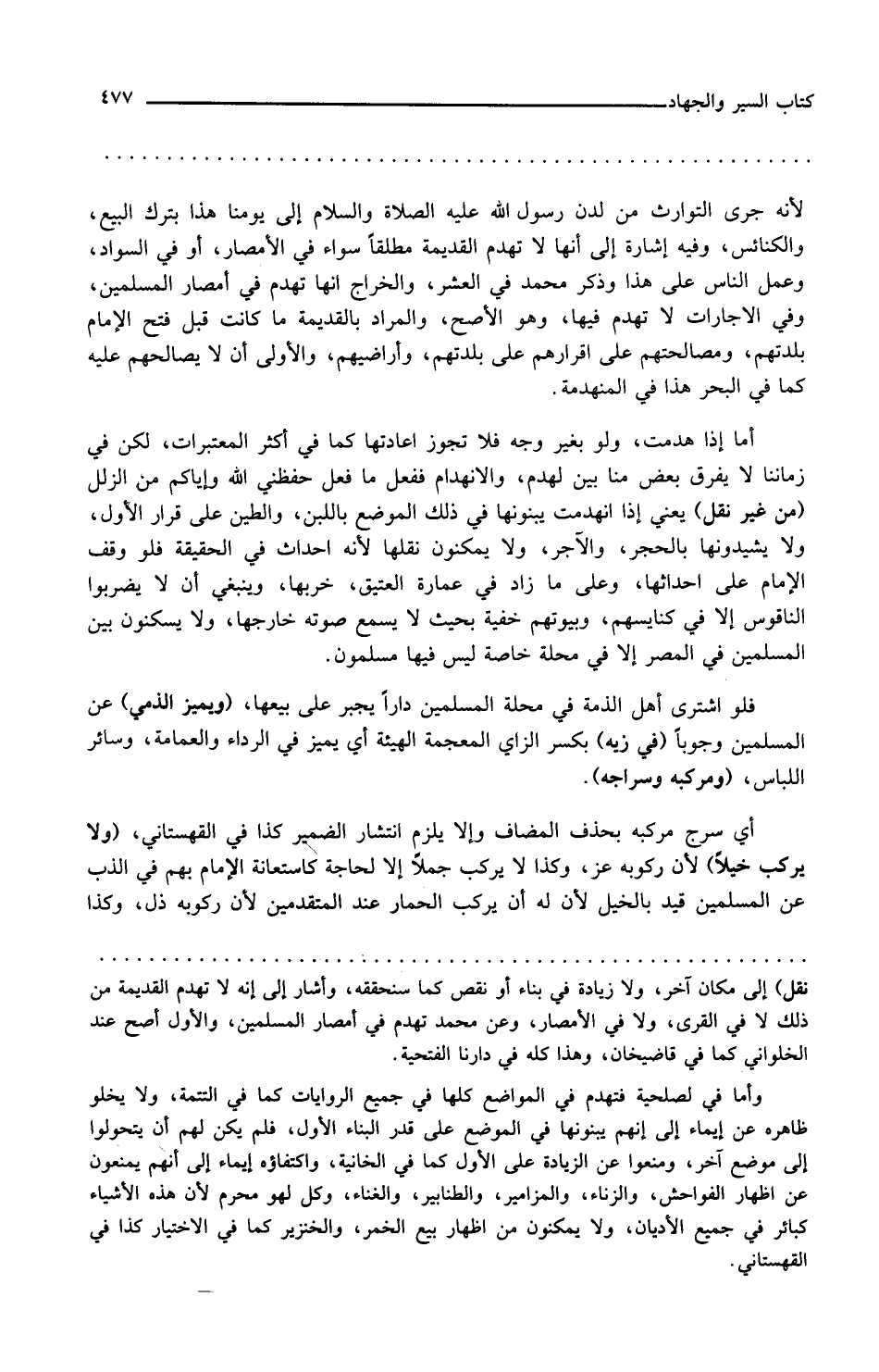 لأنه جرى التوارث من لدن رسول الله عليه الصلاة والسلام إلى يومنا هذا بترك البيع والكنائس وفيه إشارة إلى أنها لا تهدم القديمة مطلقا سواء في الأمصار أو في السواد وعمل الناس على هذا وذكر محمد في العشر والخراج أنها تهدم أمصار المسلمين وفي الإجارات لا تهدم فيها وهو الأصح والمراد بالقديمة ما كانت قبل فتح الإمام بلدتهم ومصالحتهم على إقرارهم على بلدتهم وأراضيهم والأولى أن لا يصالحهم عليه كما في البحر هذا في المنهدمة أما إذا هدمت ولو بغير وجه فلا تجوز إعادتها كما في أكثر المعتبرات لكن في زماننا لا يفرق بعض منا بين الهدم والانهدام ففعل ما فعل حفظني الله وإياكم من الزلل من غير نقل يعني إذا انهدمت يبنونها في ذلك الموضع باللبن والطين على قرار الأول ولا يشيدونها بالحجر والآجر ولا يمكنون نقلها لأنه إحداث في الحقيقة فلو وقف الإمام على إحداثها وعلى ما زاد في عمارة العتيق خربها وينبغي أن لا يضربوا الناقوس إلا في كنائسهم وبيوتهم خفية بحيث لا يسمع صوته خارجها ولا يسكنون بين المسلمين في المصر إلا في محلة خاصة ليس فيها مسلمون فلو اشترى أهل الذمة في محلة المسلمين دارا يجبر على بيعها