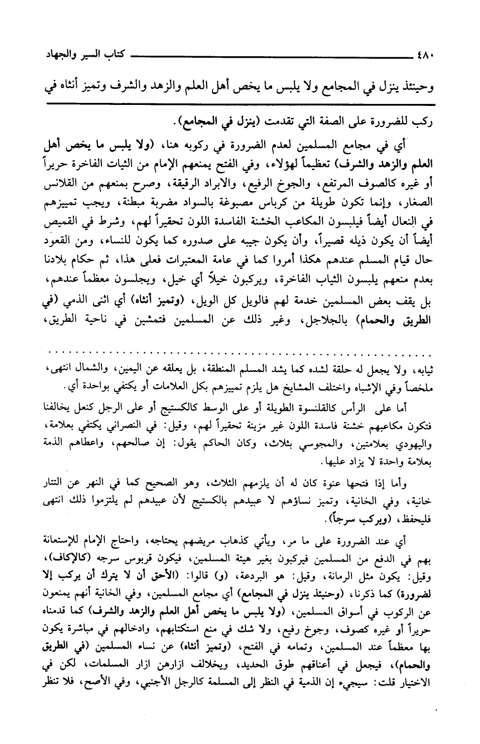 وفي الفتح يمنعهم الإمام من الثياب الفاخرة حريرا أو غيره كالصوف المرتفع والجوخ الرفيع والأبراد الرقيقة وصرح بمنعهم من القلانس الصغار وإنما تكون طويلة من كرباس مصبوغة بالسواد مضربة مبطنة ويجب تمييزهم في النعال أيضا فيلبسون المكاعب الخشنة الفاسدة اللون تحقيرا لهم وشرط في القميص أيضا أن يكون ذيله قصيرا وأن يكون جيبه على صدوره كما يكون للنساء ومن القعود حال قيام المسلم عندهم هكذا أمروا كما في عامة المعتبرات فعلى هذا ثم حكام بلادنا بعدم منعهم يلبسون الثياب الفاخرة ويركبون خيلا أي خيل ويجلسون معظما عندهم بل يقف بعض المسلمين خدمة لهم فالويل كل الويل