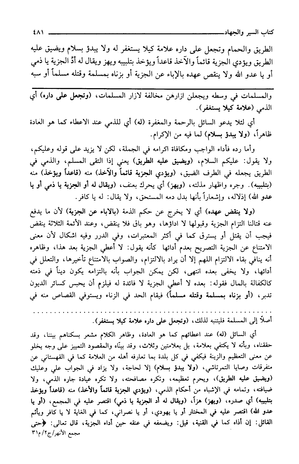 وتجعل على داره أي الذمي علامة كي لا يستغفر أي لئلا يدعو السائل بالرحمة والمغفرة له أي للذمي عند الإعطاء كما هو العادة ظاهرا ولا يبدأ بسلام لما فيه من الإكرام وأما رده فأداء الواجب ومكافأة إكرامه في الجملة لكن لا يزيد على قوله وعليكم ولا يقول عليكم السلام ويضيق عليه الطريق يعني إذا التقى المسلم والذمي في الطريق يجعله في الطرف الضيق ويؤدي الجزية قائما والآخذ منه قاعدا ويؤخذ منه بتلبيبه وجره وإظهار مذلته ويهز أي يحرك بعنف ويقال له أد الجزية يا ذمي أو يا عدو الله إذ لا إله له وإشعارا بأنها بدل دمه المستحق ولا يقال له يا كافر ولا ينقض عهده أي لا يخرج عن حكم الذمة بالإباء عن الجزية لأن ما يدفع عنه قتالنا التزام الجزية وقبولها لا أداؤها وهو باق فلا ينقض وعند الأئمة الثلاثة ينقض فيجب أن يقتل أو يسترق كما في أكثر المعتبرات وفي الدرر وفيه إشكال لأن معنى الامتناع عن الجزية التصريح بعدم أدائها كأنه يقول لا أعطي الجزية بعد هذا وظاهره أنه ينافي بقاء الالتزام اللهم إلا أن يراد بالالتزام والصواب بالامتناع تأخيرها والتعلل في أدائها ولا يخفى بعده انتهى لكن يمكن الجواب بأنه بالتزامه يكون دينا في ذمته كالكفالة بالمال فقوله بعده لا أعطي الجزية لا فائدة له فيلزم أن يحبس كسائر الديون تدبر أو بزناه بمسلمة وقتله مسلما فيقام الحد في الزناء ويستوفى القصاص منه في