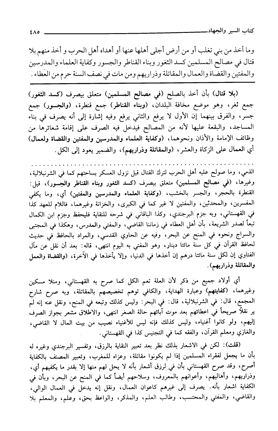 بلا قتال بأن أخذ بالصلح في مصالح المسلمين متعلق بيصرف كسد الثغور جمع ثغر وهو موضع مخافة البلدان وبناء القناطر جمع قنطرة والجسور جمع جسر والفرق بينهما أن الأول لا يرفع والثاني يرفع وفيه إشارة إلى أنه يصرف في بناء المساجد والبقعة عليها لأنه من المصالح فيدخل فيه الصرف على إقامة شعائرها من وظائف الإمامة والأذان ونحوهما وكفاية العلماء والمدرسين والمفتين والقضاة والعمال أي العمال على الزكاة والعشر والمقاتلة وذراريهم والضمير يعود إلى الكل