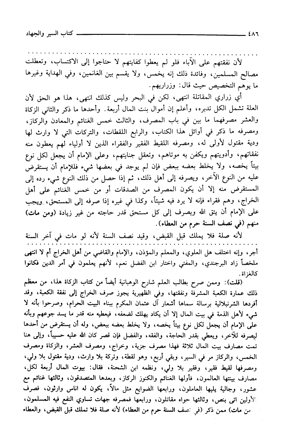 واعلم أن أموال بيت المال أربعة أحدها ما ذكر والثاني الزكاة والعشر مصرفهما ما بين في باب المصرف والثالث خمس الغنائم والمعادن والركاز ومصرفه ما ذكر في أوائل هذا الكتاب والرابع اللقطات والتركات التي لا وارث لها ودية مقتول لا ولي له ومصرفه اللقيط الفقير والفقراء الذين لا أولياء لهم يعطون منه نفقاتهم وأدويتهم ويكفن به موتاهم وتعقل جنايتهم وعلى الإمام أن يجعل لكل نوع بيتا يخصه ولا يخلط بعضه ببعض فإن لم يوجد في بعضها شيء فللإمام أن يستقرض عليه من النوع الآخر ويصرفه إلى أهل ذلك ثم إذا حصل من ذلك النوع شيء رده إلى المستقرض منه إلا أن يكون المصرف من الصدقات أو من خمس الغنائم على أهل الخراج وهم فقراء فإنه لا يرد فيه شيئا وكذا في غيره إذا صرفه إلى المستحق ويجب على الإمام أن يتق الله ويصرف إلى كل مستحق قدر حاجته من غير زيادة ومن مات منهم في نصف السنة حرم من العطاء لأنه صلة فلا يملك قبل القبض وقيد نصف السنة لأنه لو مات في آخر السنة