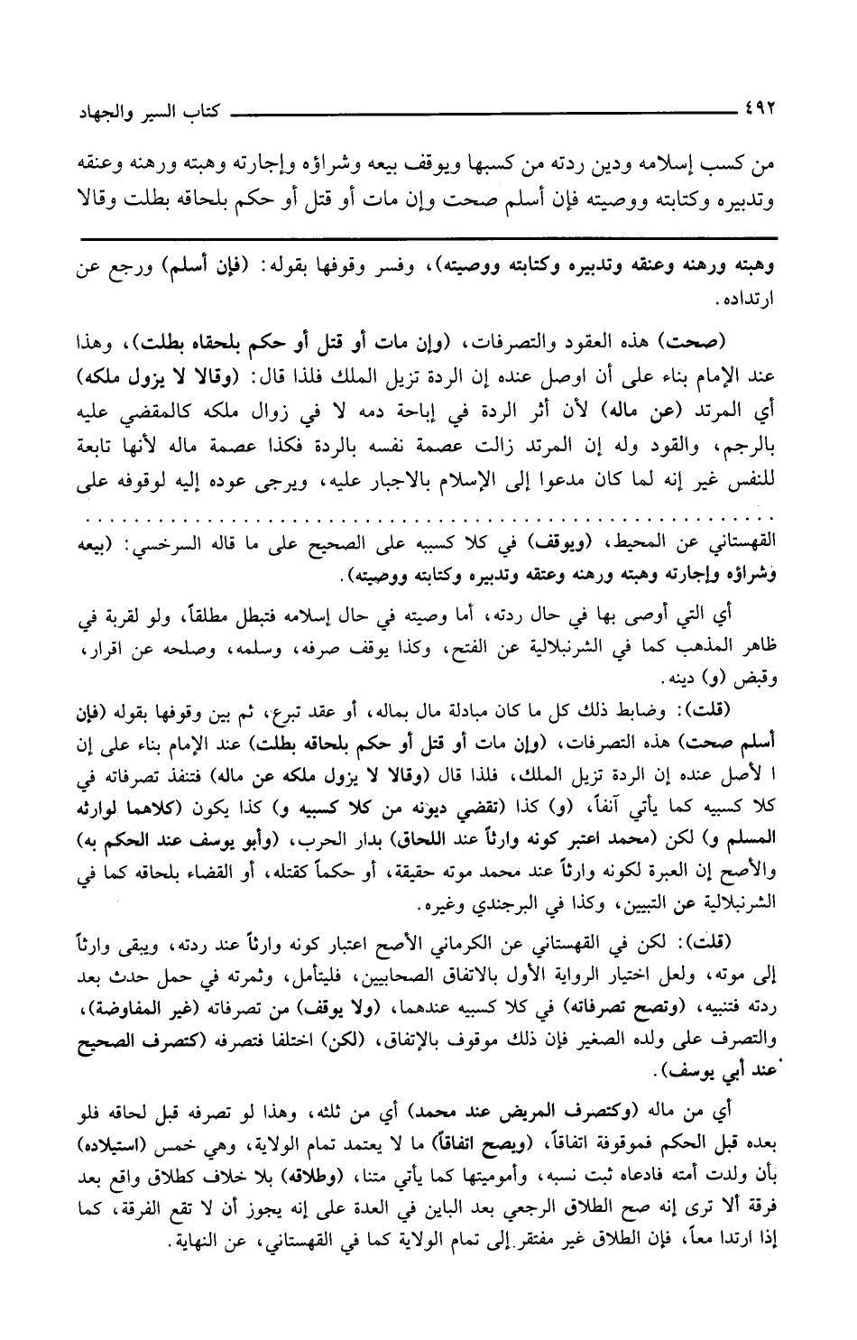 وهبته ورهنه وعتقه وتدبيره وكتابته ووصيته وفسر وقوفها بقوله فإن أسلم ورجع عن ارتداده صحت هذه العقود والتصرفات