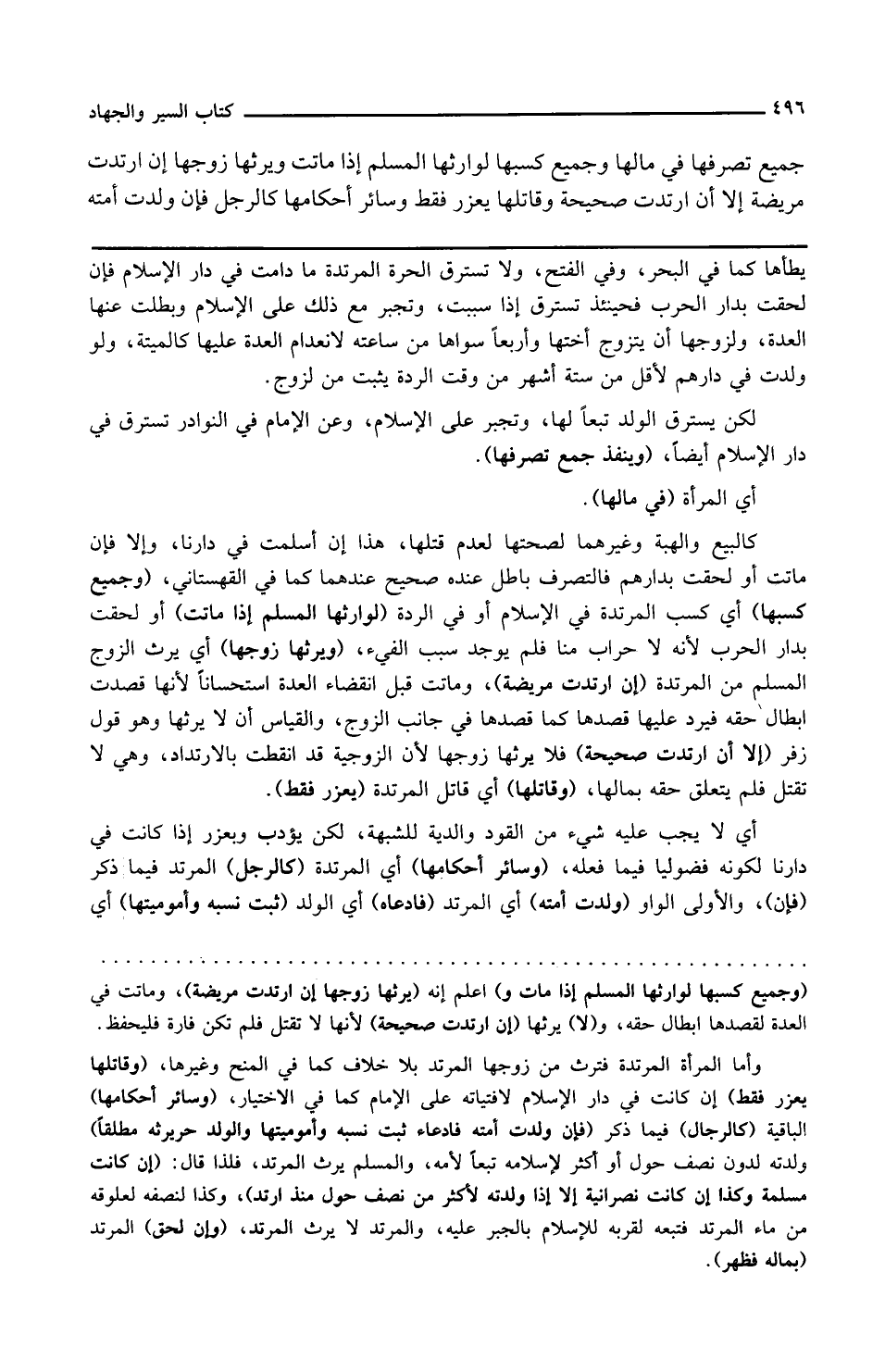 وفي الفتح ولا تسترق الحرة المرتدة ما دامت في دار الإسلام فإن لحقت بدار الحرب فحينئذ تسترق إذا سبيت وتجبر مع ذلك على الإسلام وبطلت عنها العدة ولزوجها أن يتزوج أختها وأربعا سواها من ساعته لانعدام العدة عليها كالميتة ولو ولدت في دارهم لأقل من ستة أشهر من وقت الردة يثبت من الزوج لكن يسترق الولد تبعا لها وتجبر على الإسلام وعن الإمام في النوادر تسترق في دار الإسلام أيضا وينفذ جميع تصرفها أي المرأة في مالها كالبيع والهبة وغيرهما لصحتها لعدم قتلها هذا إن أسلمت في دارنا وإلا فإن ماتت أو لحقت بدارهم فالتصرف باطل عنده صحيح عندهما كما في القهستاني وجميع كسبها أي كسب المرتدة في الإسلام أو في الردة لوارثها المسلم إذا ماتت أو لحقت بدار الحرب لأنه لا حراب منا فلم يوجد سبب الفيء ويرثها زوجها أي يرث الزوج المسلم من المرتدة إن ارتدت مريضة وماتت قبل انقضاء العدة استحسانا لأنها قصدت إبطال حقه فيرد عليها قصدها كما قصدها في جانب الزوج والقياس أن لا يرثها وهو قول زفر إلا إن ارتدت صحيحة فلا يرثها زوجها لأن الزوجية قد انقطعت بالارتداد وهي لا تقتل فلم يتعلق حقه بمالها وقاتلها أي قاتل المرتدة يعزر فقط أي لا يجب عليه شيء من القود والدية للشبهة لكن يؤدب ويعزر إذا كانت في دارنا لكونه فضوليا فيما فعله وسائر أحكامها أي المرتدة كالرجل المرتد فيما ذكر
