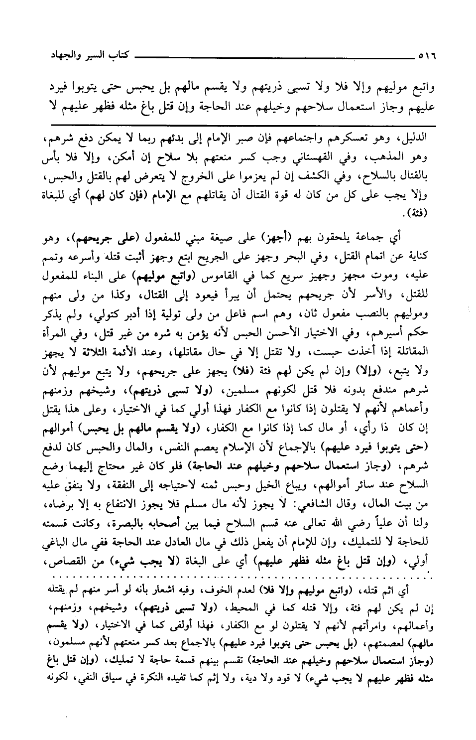 وفي الاختيار الأحسن الحبس لأنه يؤمن به شره من غير قتل وفي المرأة المقاتلة إذا أخذت حبست ولا تقتل إلا في حال مقاتلتها وعند الأئمة الثلاثة لا يجهز ولا يتبع وإلا وإن لم يكن لهم فئة فلا يجهز على جريحهم ولا يتبع موليهم لأن شرهم مندفع بدونه فلا قتل لكونهم مسلمين ولا تسبى ذريتهم وشيخهم وزمنهم وأعماهم لأنهم لا يقتلون إذا كانوا مع الكفار فهذا أولى كما في الاختيار وعلى هذا يقتل إن كان ذا رأي أو مال كما إذا كانوا مع الكفار ولا يقسم مالهم بل يحبس أموالهم حتى يتوبوا فيرد عليهم بالإجماع لأن الإسلام يعصم النفس والمال والحبس كان لدفع شرهم