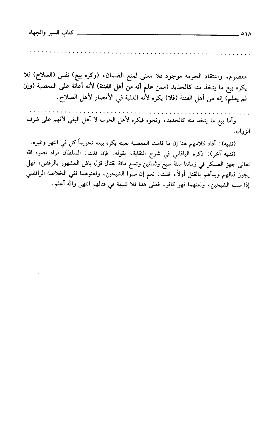 معصوم واعتقاد الحرمة موجود فلا معنى لمنع الضمان وكره بيع نفس السلاح فلا يكره بيع ما يتخذ منه كالحديد ممن علم أنه من أهل الفتنة لأنه إعانة على المعصية