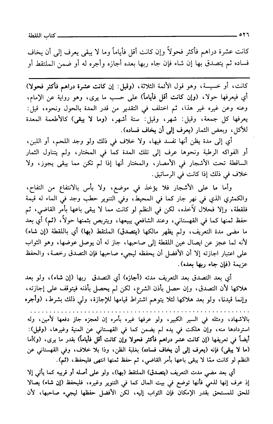 وقيل إن كانت عشرة دراهم فأكثر فحولا أي فيعرفها حولا وإن كانت أقل فأياما على حسب ما يرى وهو رواية عن الإمام وعنه وعن غيره غير هذا ثم اختلف في التقدير ومن قدر المدة بالحول ونحوه قيل يعرفها كل جمعة وقيل شهر وقيل ستة أشهر وما لا يبقى كالأطعمة المعدة للأكل وبعض الثمار يعرف إلى أن يخاف فساده أي إلى مدة يظن أنها تفسد فيها ولا خلاف في ذلك ولو وجد اللحم أو اللبن أو الفواكه الرطبة ونحوها عرف إلى تلك المدة كما في المختار ولم يتناول الثمار الساقطة تحت الأشجار في الأمصار والمختار أنها إذا لم تكن مما يبقى يجوز ولا خلاف في ذلك إذا كانت في الرساتيق وأما ما على الأشجار فلا يؤخذ في موضع ولا بأس بالانتفاع من التفاح والكمثرى الذي في نهر جار كما في المحيط