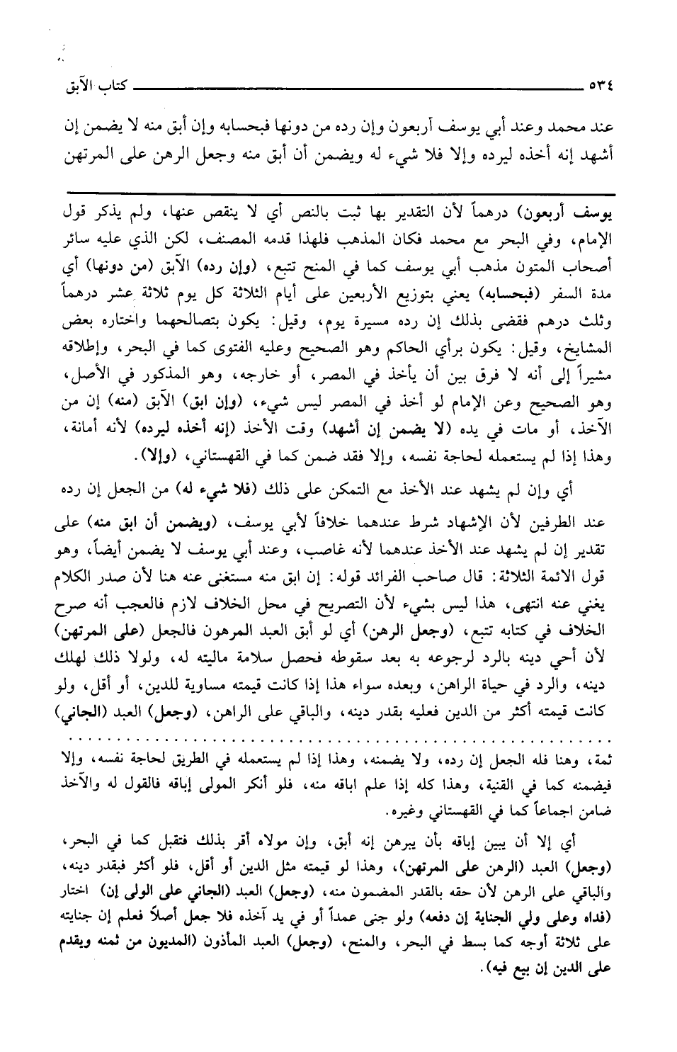 وإن أبق الآبق منه أي من الآخذ أو مات في يده لا يضمن إن أشهد وقت الأخذ أنه أخذه ليرده لأنه أمانة وهذا إذا لم يستعمله لحاجة نفسه وإلا فقد ضمن كما في القهستاني وإلا أي لم يشهد عند الأخذ مع التمكن على ذلك فلا شيء له من الجعل إن رده عند الطرفين لأن الإشهاد شرط عندهما خلافا لأبي يوسف ويضمن إن أبق منه على تقدير إن لم يشهد عند الأخذ عندهما لأنه غاصب وعند أبي يوسف لا يضمن أيضا وهو قول الأئمة الثلاثة قال صاحب الفرائد قوله إن أبق منه مستغن عنه هنا لأن صدر الكلام يغني عنه انتهى هذا ليس بشيء لأن التصريح في محل الخلاف لازم فالعجب أنه صرح الخلاف في كتابه تتبع وجعل الرهن أي لو أبق العبد المرهون فالجعل على المرتهن لأنه أحيا دينه بالرد لرجوعه به بعد سقوطه فحصل سلامة ماليته له ولولا ذلك لهلك دينه والرد في حياة الراهن وبعده سواء هذا إذا كانت قيمته مساوية للدين أو أقل ولو كانت قيمته أكثر من الدين فعليه بقدر دينه والباقي على الراهن