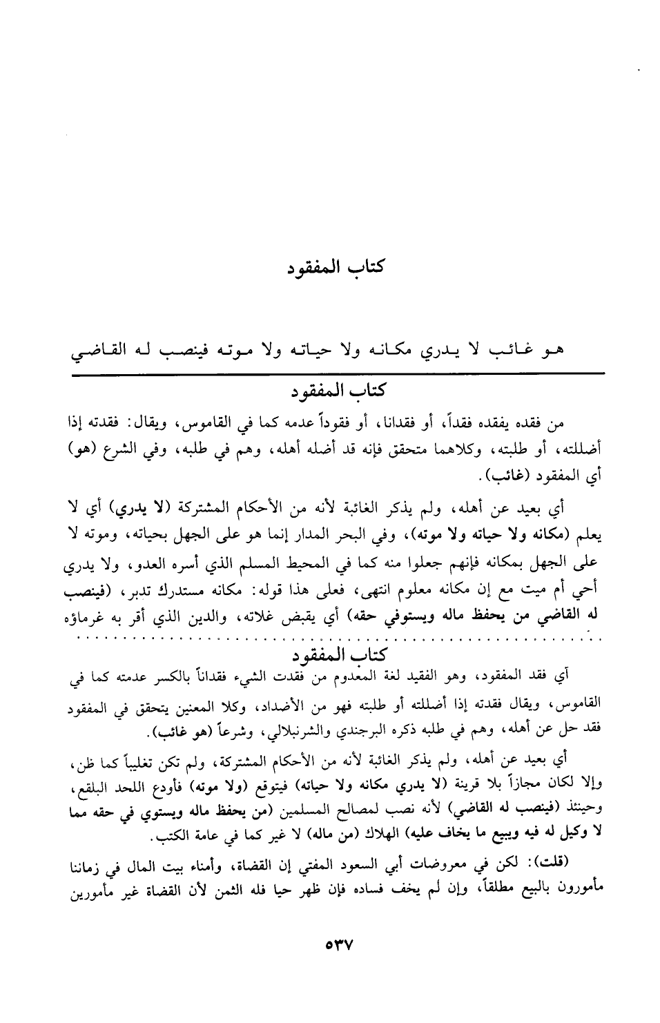 وفي الشرع هو أي المفقود غائب أي بعيد عن أهله ولم يذكر الغائبة لأنه من الأحكام المشتركة لا يدرى أي لا يعلم مكانه ولا حياته ولا موته وفي البحر المدار إنما هو على الجهل بحياته وموته لا على الجهل بمكانه فإنهم جعلوا منه كما في المحيط المسلم الذي أسره العدو ولا يدرى أحي أم ميت مع أن مكانه معلوم انتهى
