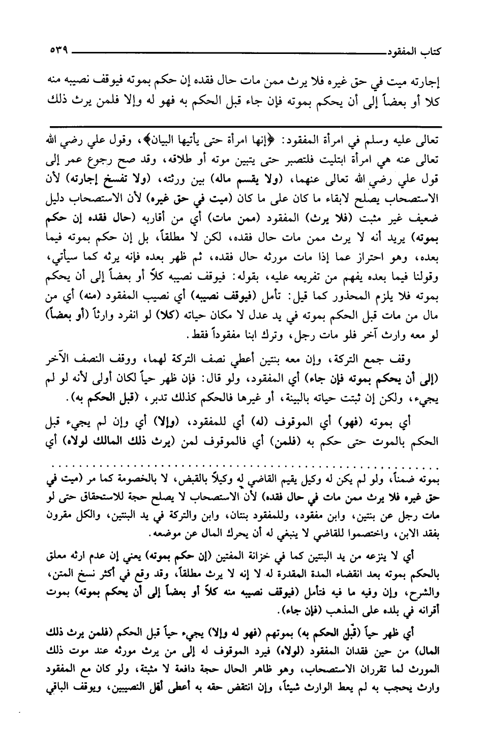 تعالى عليه وسلم في امرأة المفقود أنها امرأته حتى يأتيها البيان وقول علي رضي الله تعالى عنه هي امرأة ابتليت فلتصبر حتى يتبين موته أو طلاقه وقد صح رجوع عمر إلى قول علي