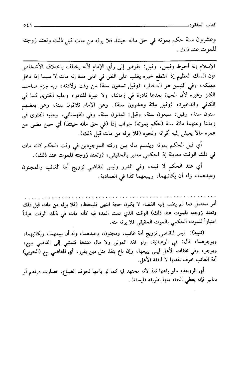 وفي التبيين هو المختار وقيل تسعون سنة من وقت ولادته وبه جزم صاحب الكنز وغيره لأن الحياة بعدها نادرة في زماننا ولا عبرة للنادر وعليه الفتوى كما في الكافي والذخيرة وقيل مائة وعشرون سنة