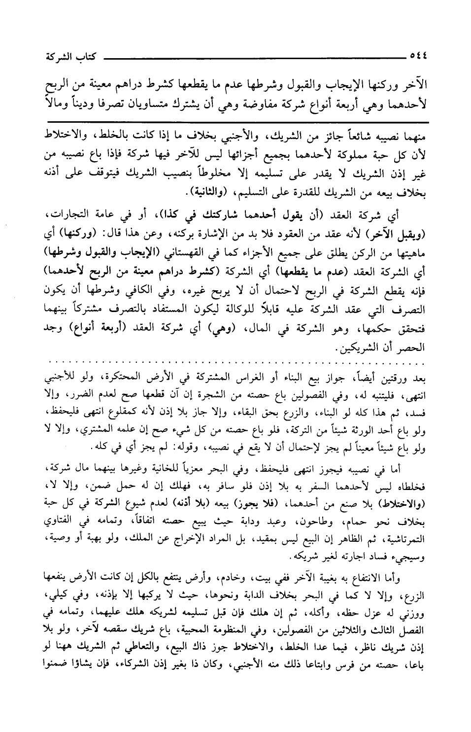 وفي الكافي وشرطها أن يكون التصرف التي عقد الشركة عليه قابلا للوكالة ليكون المستفاد بالتصرف مشتركا بينهما فتحقق حكمها وهو الشركة في المال وهي أي شركة العقد أربعة أنواع وجه الحصر أن الشريكين