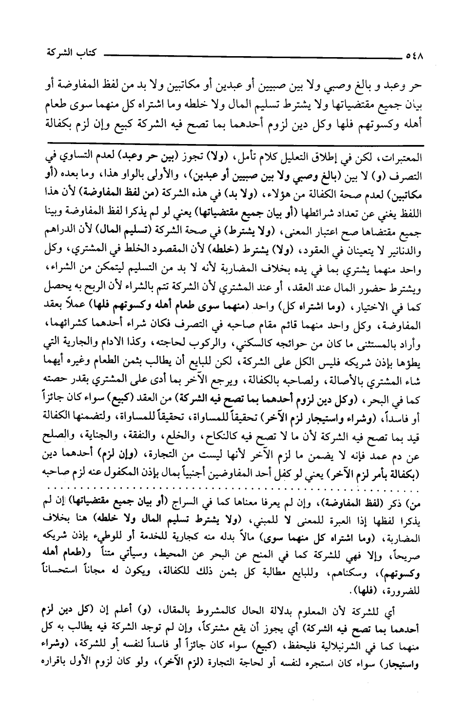 و لا بين بالغ وصبي ولا بين صبيين أو عبدين والأولى بالواو هذا وما بعده أو مكاتبين لعدم صحة الكفالة من هؤلاء ولا بد في هذه الشركة من لفظ المفاوضة لأن هذا اللفظ يغني عن تعداد شرائطها أو بيان جميع مقتضياتها يعني لو لم يذكر لفظ المفاوضة وبينا جميع مقتضاها صح اعتبارا للمعنى