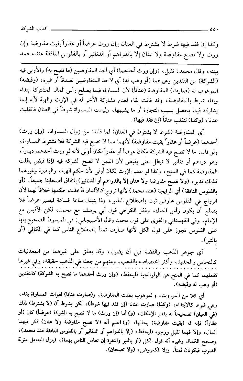 ولا تصح مفاوضة ولا عنان إلا بالدراهم أو الدنانير باتفاق أصحابنا جميعا أو بالفلوس النافقة أي الرائجة عند محمد لأنها تروج كالأثمان فأخذت حكمها خلافا لهما لأن الرواج في الفلوس عارض ثبت باصطلاح الناس وذا يتبدل ساعة فساعة فيصير عرضا فلا يصلح أن يكون رأس المال وذكر الكرخي قول أبي يوسف مع محمد لكن الأقيس مع الإمام