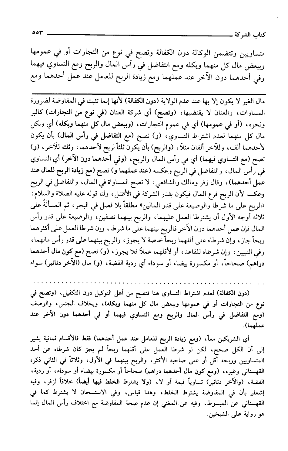 و تصح مع التساوي فيهما أي في رأس المال والربح وفي أحدهما دون الآخر أي التساوي في رأس المال والتفاضل في الربح وعكسه عند عملهما و تصح مع زيادة الربح للعامل عند عمل أحدهما