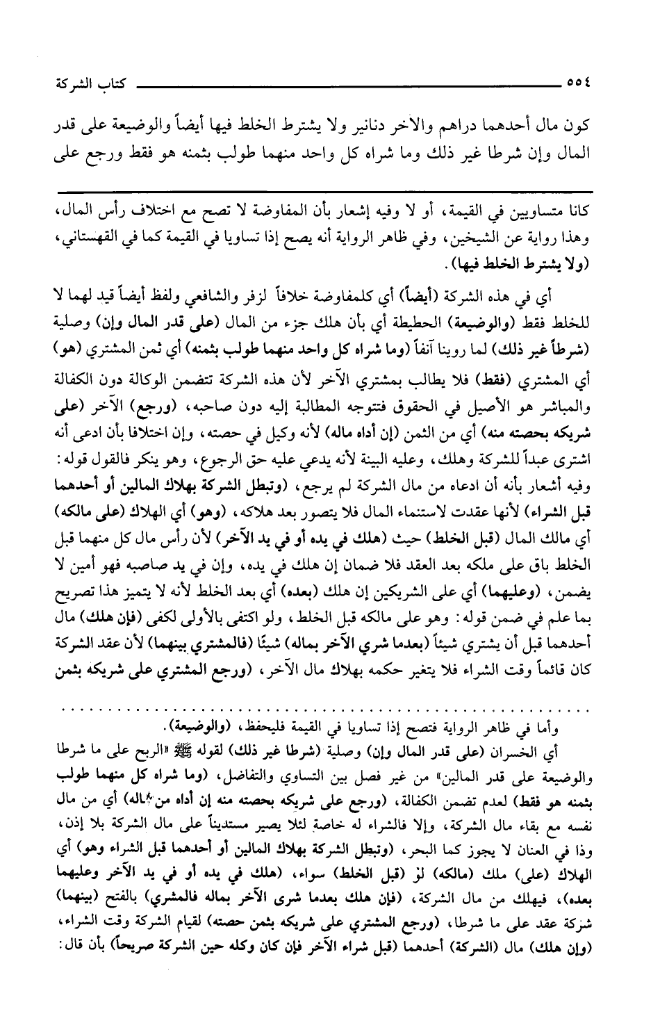 وتبطل الشركة بهلاك المالين أو أحدهما قبل الشراء لأنها عقدت لاستنماء المال فلا يتصور بعد هلاكه وهو أي الهلاك على مالكه أي مالك المال قبل الخلط حيث هلك في يده أو في يد الآخر لأن رأس مال كل منهما قبل الخلط باق على ملكه بعد العقد فلا ضمان إن هلك في يده وإن في يد صاحبه فهو أمين لا يضمن وعليهما أي على الشريكين إن هلك بعده أي بعد الخلط لأنه لا يتميز هذا تصريح بما علم في ضمن قوله وهو على مالكه قبل الخلط ولو اكتفى بالأول لكفى فإن هلك مال أحدهما قبل أن يشتري شيئا بعدما شرى الآخر بماله شيئا فالمشترى بينهما لأن عقد الشركة كان قائما وقت الشراء فلا يتغير حكمه بهلاك مال الآخر ورجع المشتري على شريكه بثمن