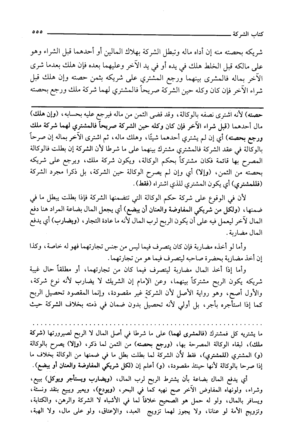 وإن هلك مال أحدهما قبل شراء الآخر فإن كان وكله حين الشركة صريحا فالمشتري لهما شركة ملك ورجع بحصته أي إن لم يشتر أحدهما شيئا وهلك ماله ثم اشترى الآخر بماله إن صرحا بالوكالة في عقد الشركة فالمشترى مشترك بينهما على ما شرطا لأن الشركة إن بطلت فالوكالة المصرح بها قائمة فكان مشتركا بحكم الوكالة ويكون شركة ملك ويرجع على شريكه بحصته من الثمن وإلا أي وإن لم يصرح بالوكالة حين الشركة بل ذكرا مجرد الشركة فللمشتري أي يكون المشترى الذي اشتراه فقط لأن في الوقوع على شركة حكم الوكالة التي تتضمنها الشركة فإذا بطلت يبطل ما في ضمنها ولكل من شريكي المفاوضة والعنان أن يبضع أي يجعل المال بضاعة المراد هنا دفع المال للآخر ليعمل فيه على أن يكون الربح لرب المال لأنه من عادة التجار ويضارب أي يدفع المال مضاربة وأما لو أخذه مضاربة فإن كان يتصرف فيما ليس من جنس تجارتهما فهو له خاصة وكذا إن أخذ مضاربة بحضرة صاحبه ليتصرف فيما هو من تجارتهما وأما إذا أخذ المال مضاربة ليتصرف فيما كان من تجارتهما أو مطلقا حال غيبة شريكه يكون الربح مشتركا بينهما
