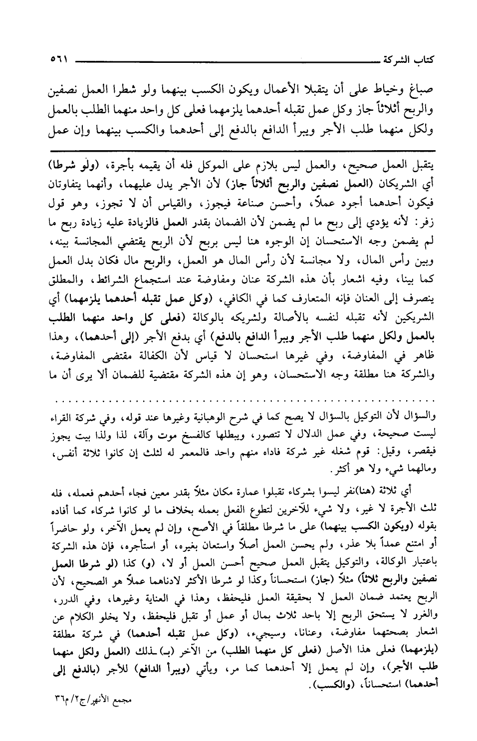 وكل عمل تقبله أحدهما يلزمهما أي الشريكين لأنه تقبله لنفسه بالأصالة ولشريكه بالوكالة فعلى كل واحد منهما الطلب بالعمل ولكل منهما طلب الأجر ويبرأ الدافع بالدفع أي بدفع الأجر إلى أحدهما وهذا ظاهر في المفاوضة وفي غيرها استحسان لا قياس لأن الكفالة مقتضى المفاوضة والشركة هنا مطلقة وجه الاستحسان وهو أن هذه الشركة مقتضية للضمان ألا يرى أن ما