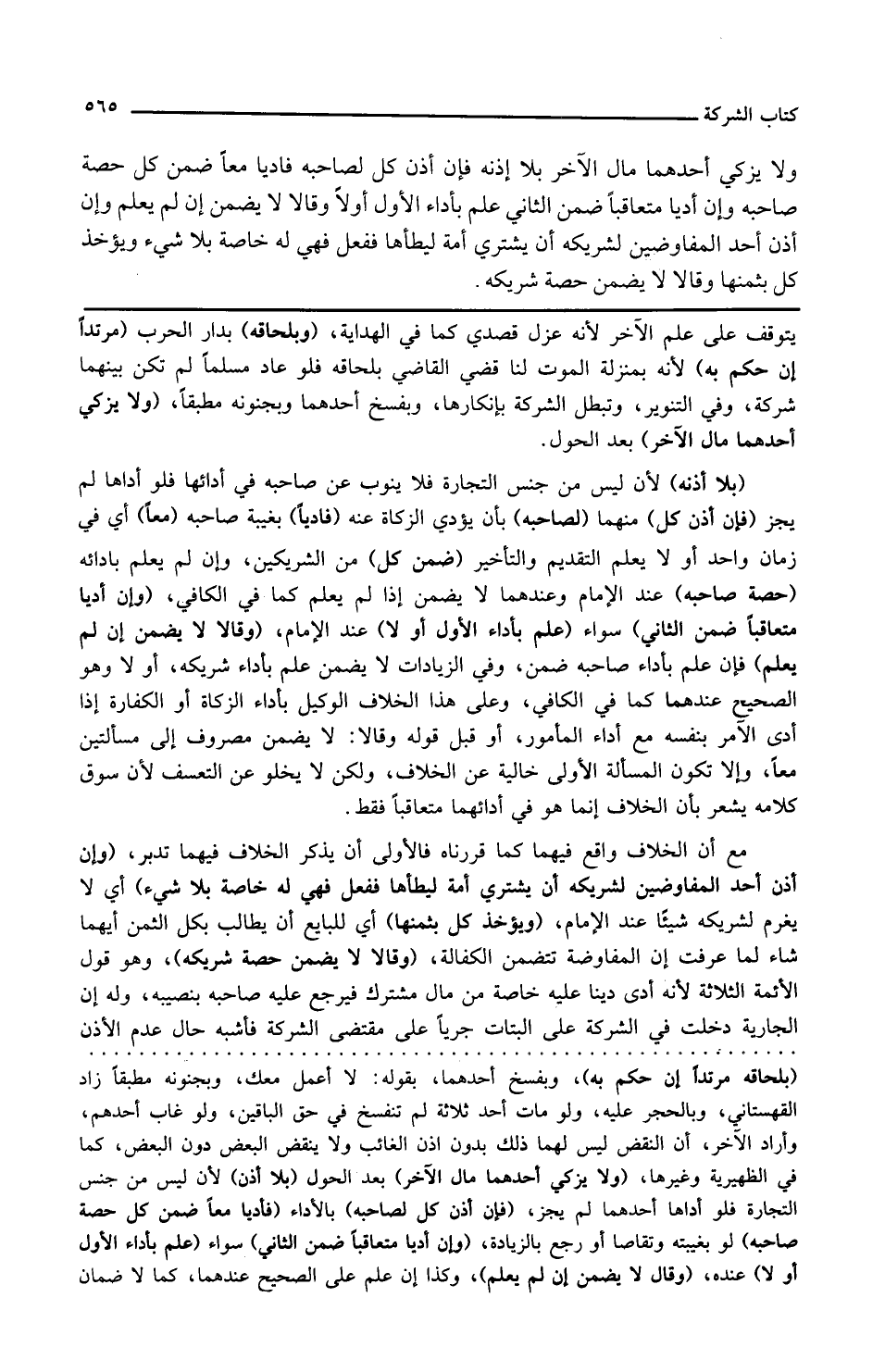 ولا يزكي أحدهما مال الآخر بعد الحول بلا إذنه لأن ليس من جنس التجارة فلا ينوب عن صاحبه في أدائها فلو أداها لم يجز فإن أذن كل منهما لصاحبه بأن يؤدي الزكاة عنه فأديا بغيبة صاحبه معا أي في زمان واحد ولا يعلم التقديم والتأخير ضمن كل من الشريكين وإن لم يعلم بأدائه حصة صاحبه عند الإمام وعندهما لا يضمن إذا لم يعلم كما في الكافي