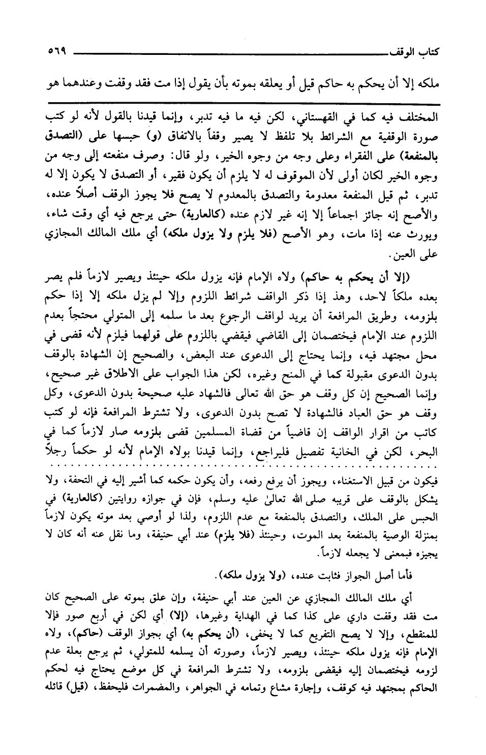 و حبسها على التصدق بالمنفعة على الفقراء وعلى وجه من وجوه الخير ولو قال وصرف منفعته إلى وجه من وجوه الخير لكان أولى لأن الموقوف له لا يلزم أن يكون فقيرا والتصدق لا يكون إلا له تدبر ثم قيل المنفعة معدومة والتصدق بالمعدوم لا يصح فلا يجوز الوقف أصلا عنده والأصح أنه جائز إجماعا إلا أنه غير لازم عنده كالعارية حتى يرجع فيه أي وقت شاء ويورث عنه إذا مات وهو الأصح فلا يلزم ولا يزول ملكه أي ملك المالك المجازي عن العين إلا أن يحكم به حاكم ولاه الإمام فإنه يزول ملكه حينئذ ويصير لازما فلم يصر بعده ملكا لأحد وهذا إذا ذكر الواقف شرائط اللزوم وإلا لم يزل ملكه إلا إذا حكم بلزومه وطريق المرافعة أن يريد الواقف الرجوع بعدما سلمه إلى المتولي محتجا بعدم اللزوم عند الإمام فيختصمان إلى القاضي فيقضي باللزوم على قولهما فيلزم لأنه قضى في محل مجتهد فيه وإنما يحتاج إلى الدعوى عند البعض والصحيح أن الشهادة بالوقف بدون الدعوى مقبولة كما في المنح وغيره لكن هذا الجواب على الإطلاق غير صحيح وإنما الصحيح أن كل وقف هو حق الله تعالى فالشهادة عليه صحيحة بدون الدعوى وكل وقف هو حق العباد فالشهادة لا تصح بدون الدعوى ولا تشترط المرافعة فإنه لو كتب كاتب من إقرار الواقف أن قاضيا من قضاة المسلمين قضى بلزومه صار لازما كما في البحر لكن في الخانية تفصيل فليراجع وإنما قيدنا بولاه الإمام لأنه لو حكما رجلا