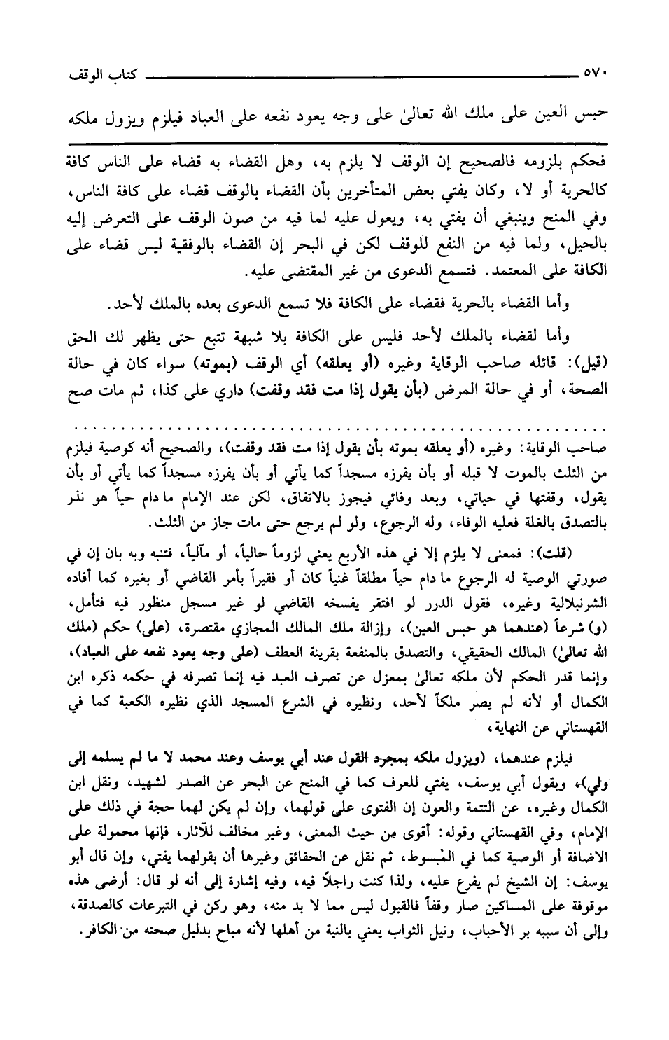 وفي المنح وينبغي أن يفتى به ويعول عليه لما فيه من صون الوقف عن التعرض إليه بالحيل ولما فيه من النفع للوقف لكن في البحر إن القضاء بالوقفية ليس قضاء على الكافة على المعتمد فتسمع الدعوى من غير المقتضى عليه وأما القضاء بالحرية فقضاء على الكافة فلا تسمع الدعوى بعده بالملك لأحد وأما القضاء بالملك لأحد فليس على الكافة بلا شبهة تتبع حتى يظهر لك الحق قيل قائله صاحب الوقاية وغيره أو يعلقه أي الوقف بموته سواء كان في حالة الصحة أو في حالة المرض بأن يقول إذا مت فقد وقفت داري على كذا ثم مات صح