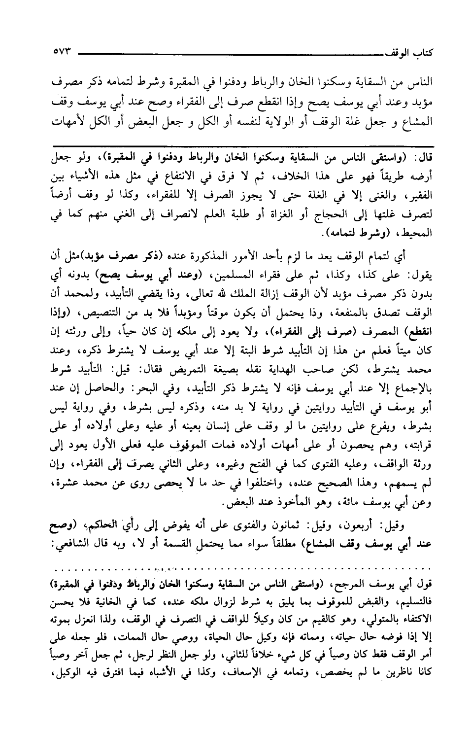 وفي رواية ليس بشرط ويفرع على روايتين ما لو وقف على إنسان بعينه أو عليه وعلى أولاده أو على قرابته وهم يحصون أو على أمهات أولاده فمات الموقوف عليه فعلى الأول يعود إلى ورثة الواقف وعليه الفتوى كما في الفتح وغيره وعلى الثاني يصرف إلى الفقراء وإن لم يسمهم وهذا الصحيح عنده واختلفوا في حد ما لا يحصى روي عن محمد عشرة وعن أبي يوسف مائة وهو المأخوذ عند البعض وقيل أربعون وقيل ثمانون والفتوى على أنه يفوض إلى رأي الحاكم