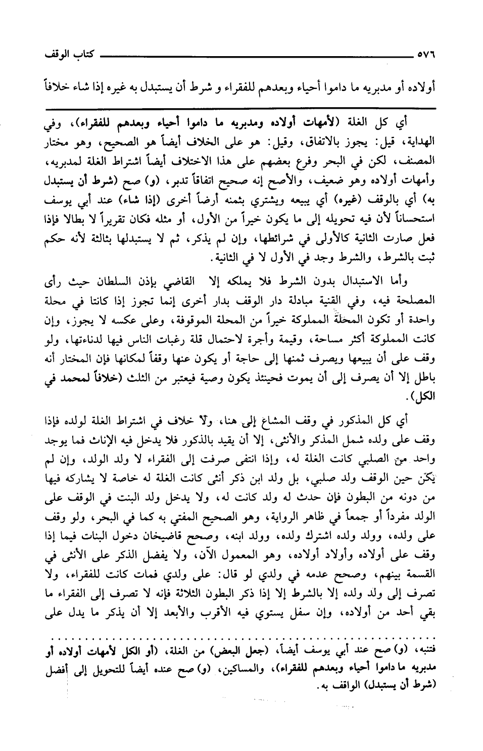 وفي القنية مبادلة دار الوقف بدار أخرى أنما تجوز إذا كانتا في محلة واحدة أو تكون المحلة المملوكة خيرا من المحلة الموقوفة وعلى عكسه لا يجوز وإن كانت المملوكة أكثر مساحة وقيمة وأجرة لاحتمال قلة رغبات الناس فيها لدناءتها ولو وقف على أن يبيعها ويصرف ثمنها إلى حاجة أو يكون ثمنها وقفا لمكانها فإن المختار أنه باطل إلا أن يصرف إلى أن يموت فحينئذ يكون وصية فيعتبر من الثلث خلافا لمحمد في الكل أي كل المذكور في وقف المشاع إلى هنا ولا خلاف في اشتراط الغلة لولده فإذا وقف على ولده شمل المذكر والأنثى إلا أن يقيد بالذكور فلا يدخل فيه الإناث فما يوجد واحد من الصلبي كانت الغلة له وإذا انتفى صرفت إلى الفقراء لا ولد الولد وإن لم يكن حين الوقف ولد صلبي بل ولد ابن ذكر أو أنثى كانت الغلة خاصة لا يشاركه فيها من دونه من البطون فإن حدث له ولد كانت له ولا يدخل ولد البنت في الوقف على الولد مفردا أو جمعا في ظاهر الراوية وهو الصحيح المفتى به كما في البحر ولو وقف على ولده وولد ولده اشترك ولده وولد ابنه وصحح قاضي خان دخول البنات فيما إذا وقف على أولاده وأولاد أولاده وهو المعمول به الآن ولا يفضل الذكر على الأنثى في القسمة بينهم وصحح عدمه في ولدي لو قال على ولدي فمات كانت للفقراء ولا تصرف إلى ولد ولده إلا بالشرط إلا إذا ذكر البطون الثلاثة فإنه لا تصرف إلى الفقراء ما بقي أحد من أولاده وإن سفل يستوي فيه الأقرب والأبعد إلا أن يذكر ما يدل
