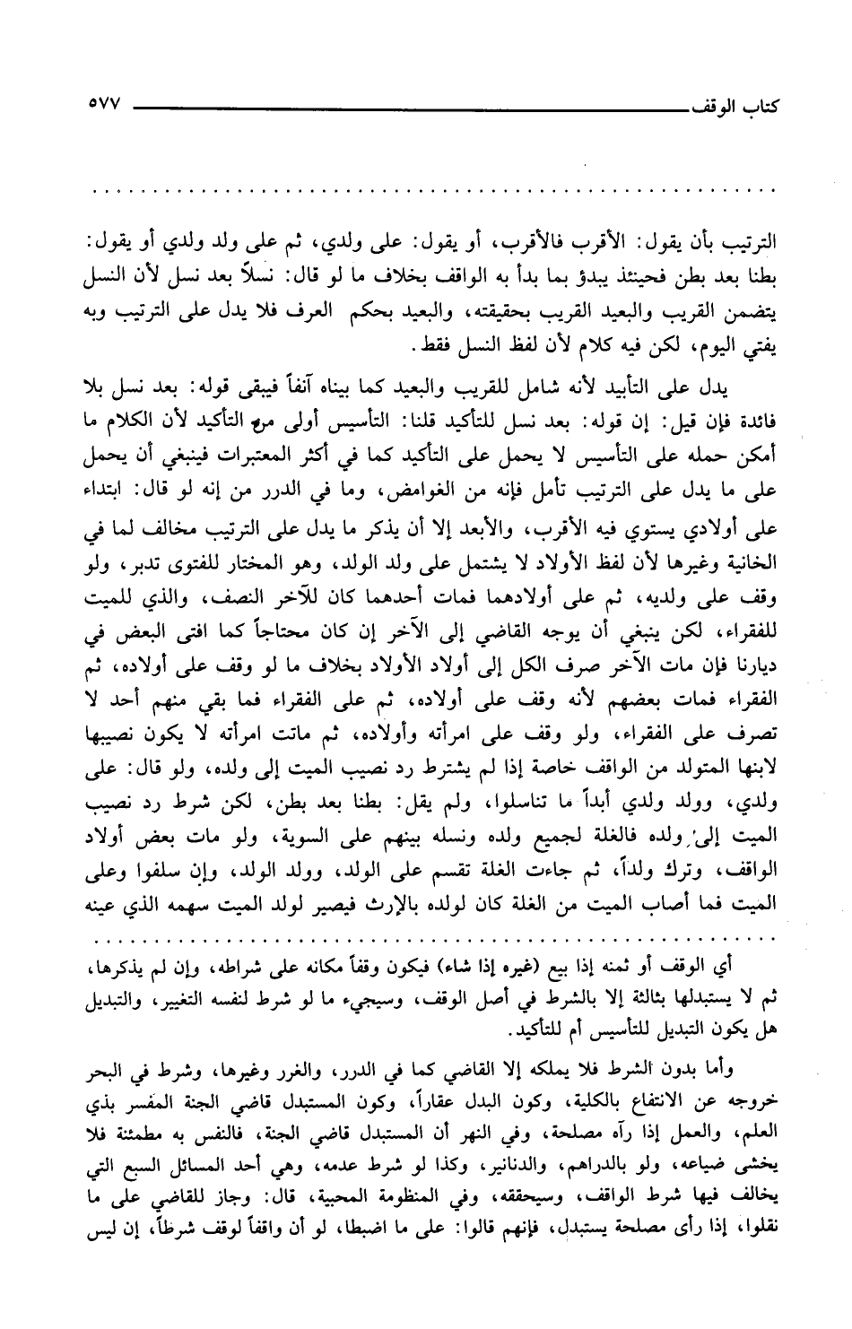 على الترتيب بأن يقول الأقرب فالأقرب أو يقول على ولدى ثم على ولد ولدي أو يقول بطنا بعد بطن فحينئذ يبدأ بما بدأ به الواقف بخلاف ما لو قال نسلا بعد نسل لأن النسل يتضمن القريب والبعيد القريب بحقيقته والبعيد بحكم العرف فلا يدل على الترتيب وبه يفتى اليوم لكن فيه كلام لأن لفظ النسل فقط يدل على التأبيد لأنه شامل للقريب والبعيد كما بيناه آنفا فيبقى قوله بعد نسل بلا فائدة فإن قيل إن قوله بعد نسل للتأكيد قلنا التأسيس أولى من التأكيد لأن الكلام ما أمكن حمله على التأسيس لا يحمل على التأكيد كما في أكثر المعتبرات فينبغي أن يحمل على ما يدل على الترتيب تأمل فإنه من الغوامض وما في الدرر من أنه لو قال ابتداء على أولادي يستوي فيه الأقرب والأبعد إلا أن يذكر ما يدل على الترتيب مخالف لما في الخانية وغيرها لأن لفظ الأولاد لا يشتمل على ولد الولد وهو المختار للفتوى تدبر ولو وقف على ولديه ثم على أولادهما فمات أحدهما كان للآخر النصف والذي للميت للفقراء لكن ينبغي أن يوجه القاضي إلى الآخر إن كان محتاجا كما أفتى البعض في ديارنا فإن مات الآخر صرف الكل إلى أولاد الأولاد بخلاف ما لو وقف على أولاده ثم الفقراء فمات بعضهم لأنه وقف على أولاده ثم على الفقراء فما بقي منهم أحد لا تصرف على الفقراء ولو وقف على امرأته وأولاده ثم ماتت امرأته لا يكون نصيبها لابنها المتولد من الواقف خاصة إذا لم يشترط رد نصيب الميت إلى ولده ولو قال على ولدي وولد ولدي أبدا ما تناسلوا ولم يقل بطنا بعد بطن لكن شرط رد نصيب الميت إلى ولده فالغلة لجميع ولده ونسله بينهم على السوية ولو مات بعض أولاد الواقف وترك ولدا ثم جاءت الغلة تقسم على الولد وولد الولد وإن سفلوا وعلى الميت فما أصاب الميت من الغلة كان لولده بالإرث فيصير لولد الميت سهمه الذي عينه