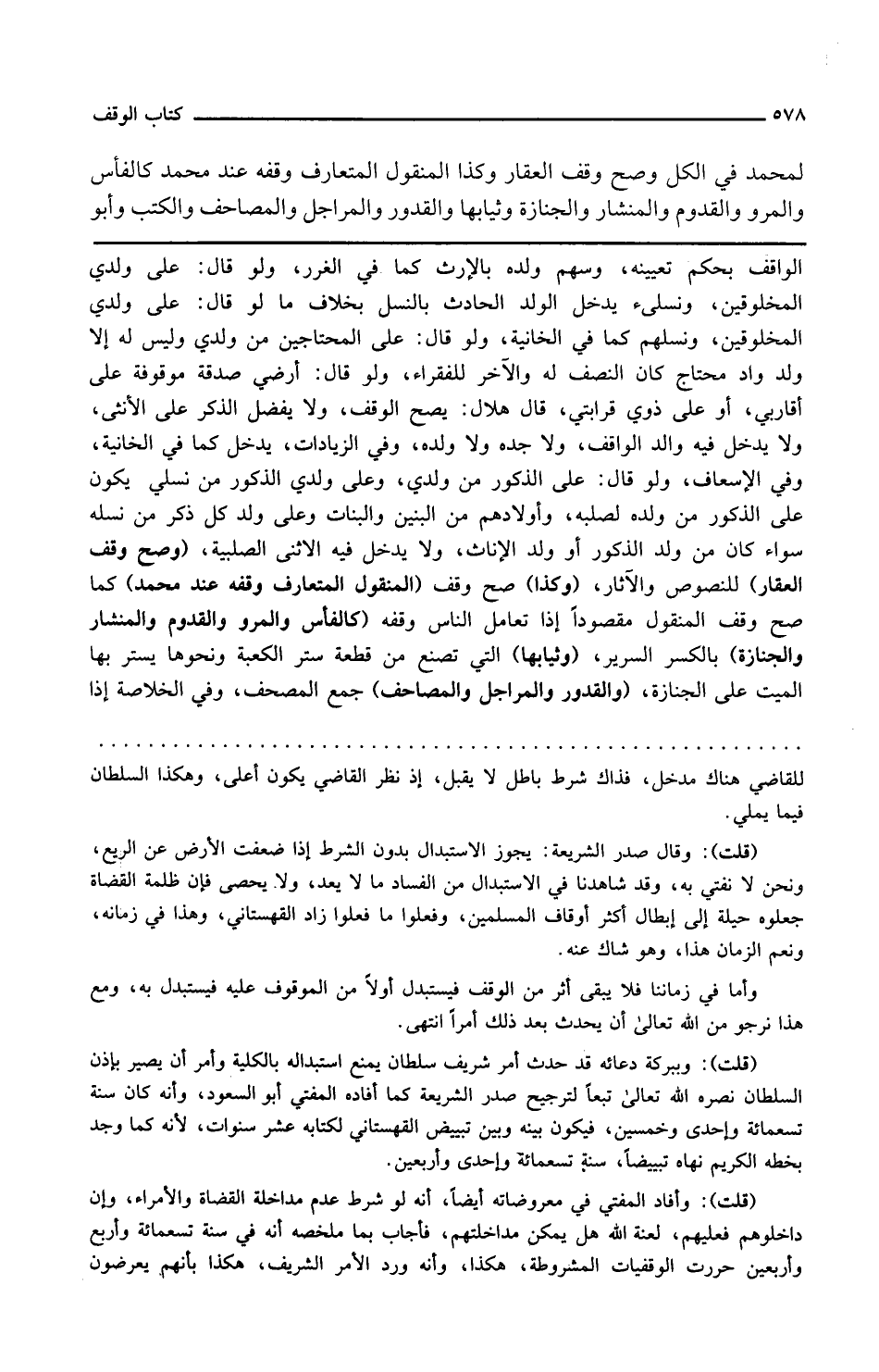 الواقف بحكم تعيينه وسهم ولده بالإرث كما في الغرر ولو قال على ولدي المخلوقين ونسلي يدخل الولد الحادث بالنسل بخلاف ما لو قال على ولدي المخلوقين ونسلهم كما في الخانية ولو قال على المحتاجين من ولدي وليس له إلا ولد واحد محتاج كان النصف له والآخر للفقراء ولو قال أرضي صدقة موقوفة على أقاربي أو على قرابتي أو على ذوي قرابتي قال هلال يصح الوقف ولا يفضل الذكر على الأنثى ولا يدخل فيه والد الواقف ولا جده ولا ولده