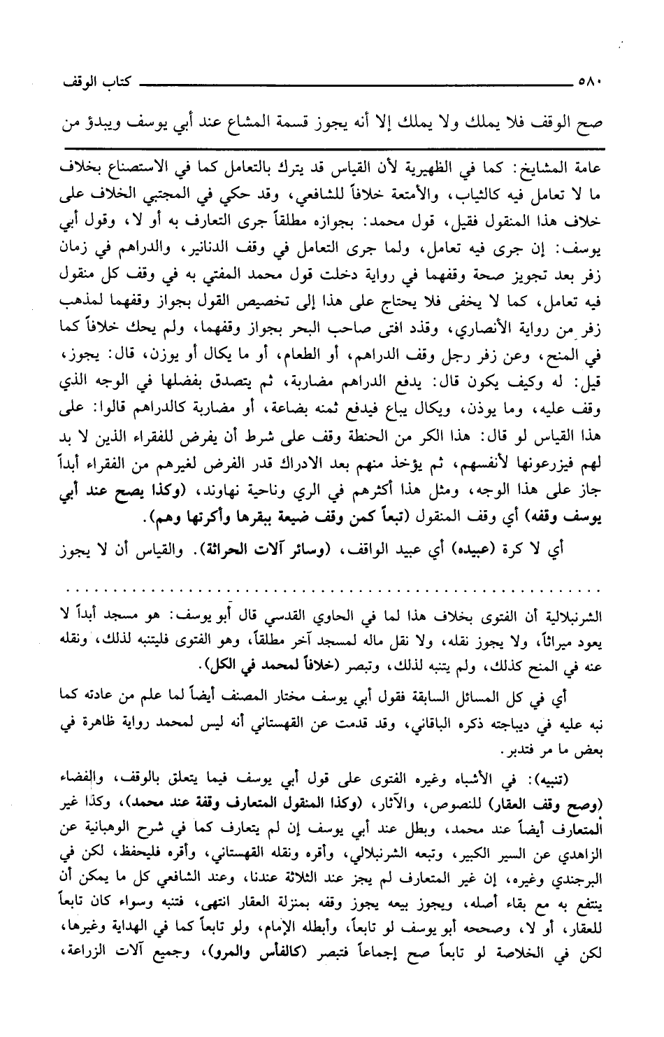 عامة المشايخ كما في الظهيرية لأن القياس قد يترك بالتعامل كما في الاستصناع بخلاف ما لا تعامل فيه كالثياب والأمتعة خلافا للشافعي وقد حكى في المجتبى الخلاف على خلاف هذا المنقول فقيل قول محمد بجوازه مطلقا جرى التعارف به أولا وقول أبي يوسف إن جرى فيه تعامل ولما جرى التعامل في وقف الدنانير والدراهم في زمان زفر بعد تجويز صحة وقفهما في رواية دخلت تحت قول محمد المفتى به في وقف كل منقول فيه تعامل كما لا يخفى فلا يحتاج على هذا إلى تخصيص القول بجواز وقفهما لمذهب زفر من رواية الأنصاري وقد أفتى صاحب البحر بجواز وقفهما ولم يحك خلافا كما في المنح وعن زفر رجل وقف الدراهم أو الطعام أو ما يكال أو يوزن قال يجوز قيل له وكيف يكون قال يدفع الدراهم مضاربة ثم يتصدق بفضلها في الوجه الذي وقف عليه وما يوزن ويكال يباع فيدفع ثمنه بضاعة أو مضاربة كالدراهم قالوا على هذا القياس لو قال الكر من الحنطة وقف على شرط أن يفرق للفقراء الذين لا بد لهم فيزرعونها لأنفسهم ثم يؤخذ منهم بعد الإدراك قدر الفرض لغيرهم من الفقراء أبدا جاز على هذا الوجه ومثل هذا أكثرهم في الري وناحية نهاوند