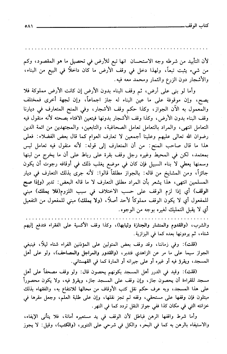 وفي المنح المتعارف في ديارنا وقف البناء بدون الأرض وكذا وقف الأشجار بدونها فيتعين الإفتاء بصحته لأنه منقول فيه التعامل انتهى والمراد بالتعامل تعامل الصحابة والتابعين والمجتهدين من أئمة الدين رضوان الله تعالى عليهم وعلينا أجمعين لا تعارف العوام كما قال بعض الفضلاء فعلى هذا ما قال صاحب المنح من أن المتعارف إلى قوله لأنه منقول فيه تعامل ليس بمعتمد لكن في المحيط وغيره رجل وقف بقرة على رباط على أن ما يخرج من لبنها وسمنها يعطى لأبناء السبيل فإن كان في موضع يغلب ذلك في أوقافه رجوت أن يكون جائزا ومن المشايخ من قاله بالجواز مطلقا قالوا لأنه جرى بذلك التعارف في ديار المسلمين انتهى هذا يشعر بأن المراد مطلق التعارف لا ما قاله البعض تدبر