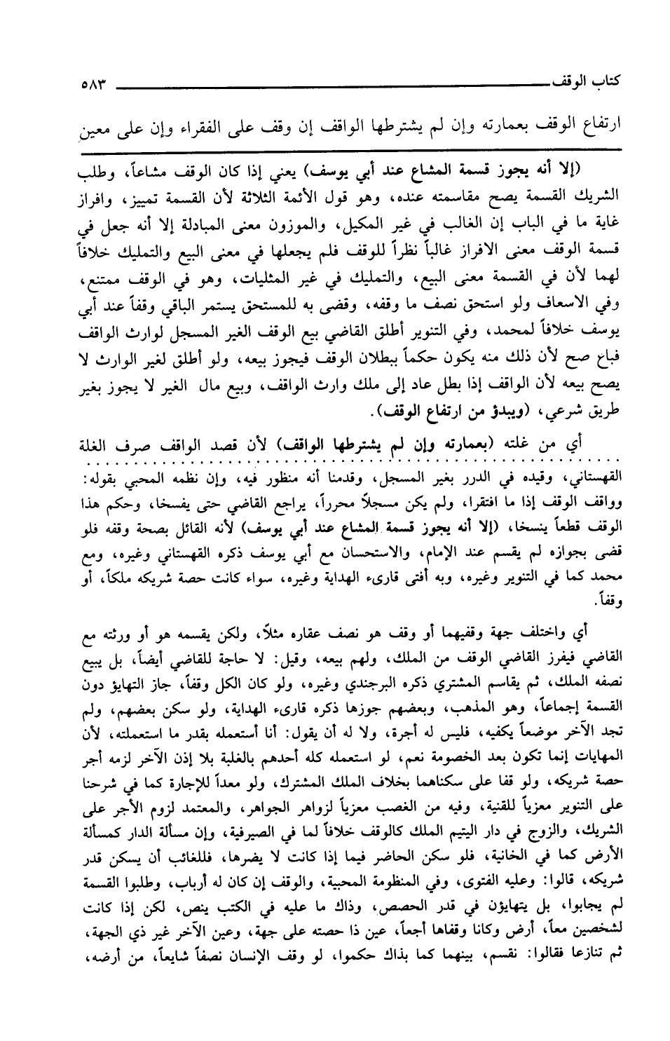 إلا أنه يجوز قسمة المشاع عند أبي يوسف يعني إذا كان الوقف مشاعا وطلب الشريك القسمة يصح مقاسمته عنده وهو قول الأئمة الثلاثة لأن القسمة تمييز وإفراز غاية ما في الباب أن الغالب في غير المكيل والموزون معنى المبادلة إلا أنه جعل في قسمة الوقف معنى الإفراز غالبا نظرا للوقف فلم يجعلها في معنى البيع والتمليك خلافا لهما لأن في القسمة معنى البيع والتمليك في غير المثليات وهو في الوقف ممتنع