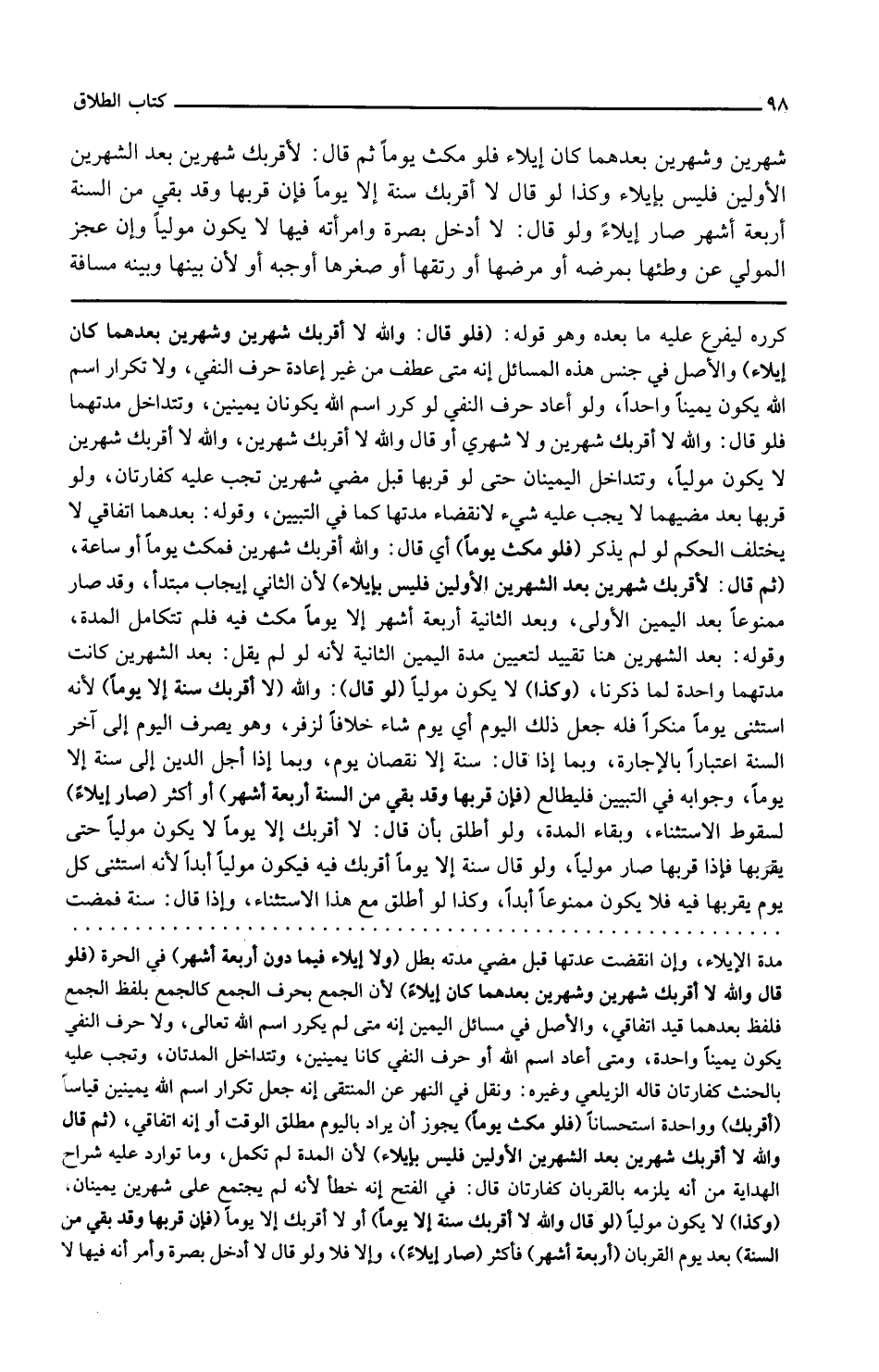 وكذا لا يكون موليا لو قال والله لا أقربك سنة إلا يوما لأنه استثنى يوما منكرا فله جعل ذلك اليوم أي يوم شاء خلافا لزفر وهو يصرف اليوم إلى آخر السنة اعتبارا بالإجارة وبما إذا قال سنة إلا نقصان يوم وبما إذا أجل الدين إلى سنة إلا يوما وجوابه في التبيين فليطالع فإن قربها وقد بقي من السنة أربعة أشهر أو أكثر صار إيلاء لسقوط الاستثناء وبقاء المدة ولو أطلق بأن قال لا أقربك إلا يوما لا يكون موليا حتى يقربها فإذا قربها صار موليا ولو قال سنة إلا يوما أقربك فيه فيكون موليا أبدا لأنه استثنى كل يوم يقربها فيه فلا يكون ممنوعا أبدا وكذا لو أطلق مع هذا الاستثناء وإذا قال سنة فمضت
