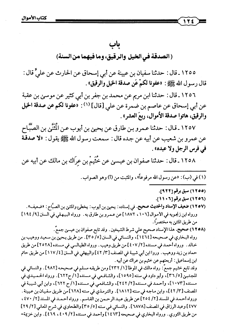 1258 - (1358) قَالَ: حَدَّثَنَا صَفْوَانُ بْنُ عِيسَى، عَنْ خُثَيْمِ بْنِ عِرَاكِ بْنِ مَالِكٍ، عَنْ أَبِيهِ، عَنْ #125# أَبِي هُرَيْرَةَ، عَنِ النَّبِيِّ صَلَّى اللهُ عَلَيْهِ وَسَلَّمَ قَالَ: لَيْسَ عَلَى الْمُسْلِمِ صَدَقَةٌ فِي عَبْدِهِ وَلَا فَرَسِهِ.