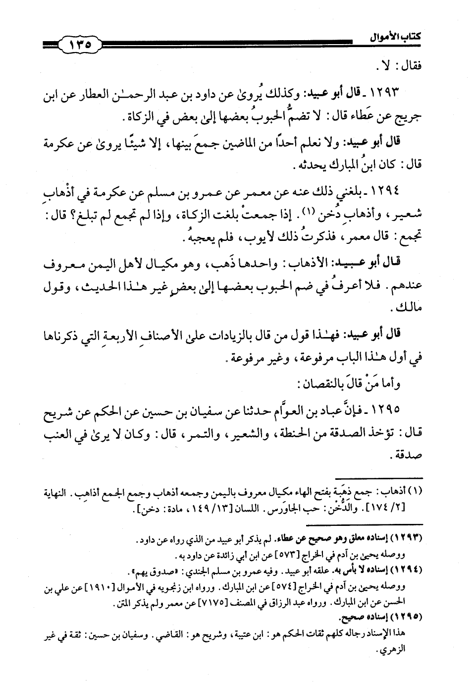 1293 - (1401) قَالَ أَبُو عُبَيْدٍ: وَكَذَلِكَ يُرْوَى عَنْ دَاوُدَ بْنِ عَبْدِ الرَّحْمَنِ الْعَطَّارِ عَنِ ابْنِ جُرَيْجٍ عَنْ عَطَاءٍ قَالَ: لَا تُضَمُّ الْحُبُوبُ بَعْضُهَا إِلَى بَعْضٍ فِي الزَّكَاةِ قَالَ أَبُو عُبَيْدٍ: وَلَا نَعْلَمُ أَحَدًا مِنَ الْمَاضِينَ جَمَعَ بَيْنَهَا، إِلَّا شَيْئًا يُرْوَى عَنْ عِكْرِمَةَ قَالَ: كَانَ ابْنُ الْمُبَارَكِ يُحَدِّثُهُ.