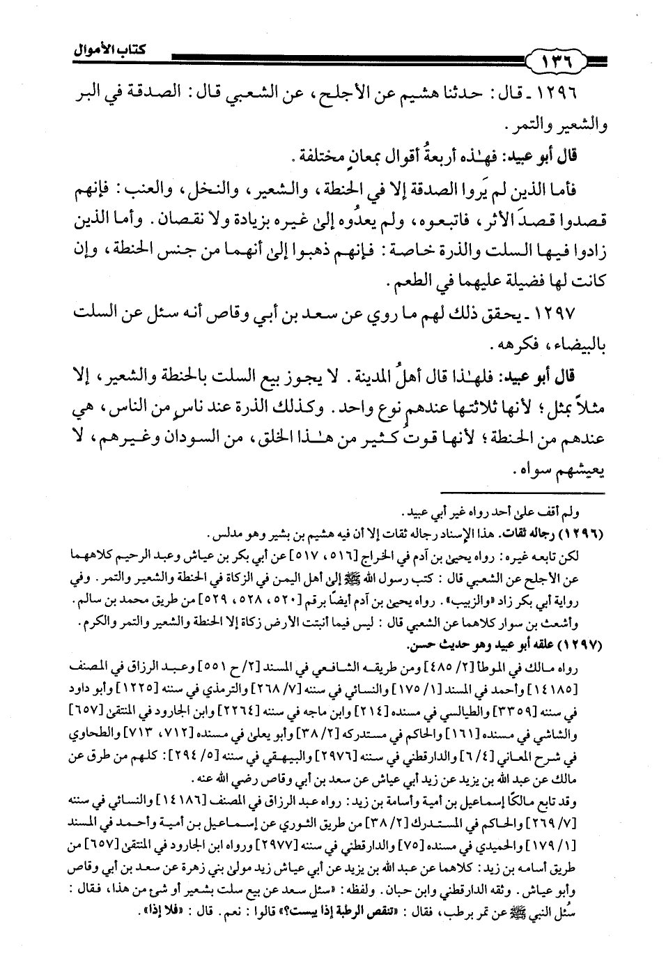 1296 - (1404) قَالَ: حَدَّثَنَا هُشَيْمٌ، عَنِ الْأَجْلَحِ، عَنِ الشَّعْبِيِّ، قَالَ: الصَّدَقَةُ فِي الْبُرِّ وَالشَّعِيرِ وَالتَّمْرِ قَالَ أَبُو عُبَيْدٍ: فَهَذِهِ أَرْبَعَةُ أَقْوَالٍ بِمَعَانٍ مُخْتَلِفَةٍ، فَأَمَّا الَّذِينَ لَمْ يَرَوُا الصَّدَقَةَ إِلَّا فِي الْحِنْطَةِ، وَالشَّعِيرِ، وَالنَّخْلِ، وَالْعِنَبِ، فَإِنَّهُمْ قَصَدُوا قَصْدَ الْأَثَرِ، فَاتَّبِعُوهُ، وَلَمْ يَعْدُوهُ إِلَى غَيْرِهِ بِزِيَادَةٍ، وَلَا نُقْصَانٍ، وَأَمَّا الَّذِينَ زَادُوا فِيهَا السُّلْتَ وَالذُّرَةَ خَاصَّةً، فَإِنَّهُمْ ذَهَبُوا إِلَى أَنَّهُمَا مِنْ جِنْسِ الْحِنْطَةِ، وَإِنْ كَانَتْ لَهَا فَضِيلَةٌ عَلَيْهِمَا فِي الطَّعْمِ.
