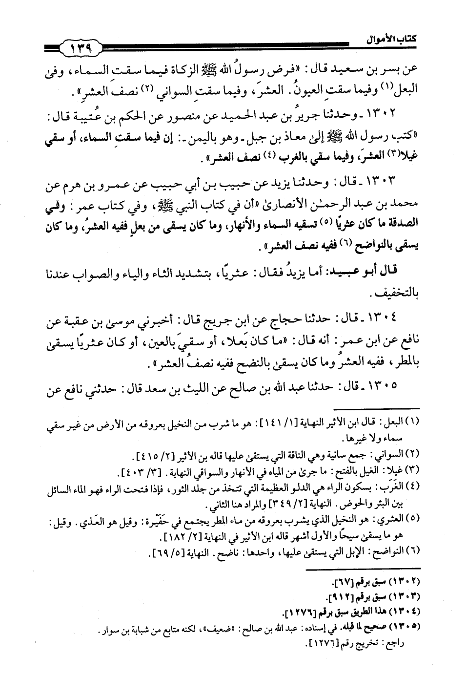 1303 - (1412) قَالَ: وَحَدَّثَنَا يَزِيدُ، عَنْ حَبِيبِ بْنِ أَبِي حَبِيبٍ، عَنْ عَمْرِو بْنِ هَرِمٍ، عَنْ مُحَمَّدِ بْنِ عَبْدِ الرَّحْمَنِ الْأَنْصَارِيِّ، أَنَّ فِي كِتَابِ النَّبِيِّ صَلَّى اللهُ عَلَيْهِ وَسَلَّمَ، وَفِي كِتَابِ عُمَرَ فِي الصَّدَقَةِ: مَا كَانَ عَثَرِيًّا تَسْقِيهِ السَّمَاءُ وَالْأَنْهَارُ، وَمَا كَانَ يُسْقَى مِنْ بَعْلٍ فَفِيهِ الْعُشْرُ، وَمَا كَانَ يُسْقَى بِالنَّوَاضِحِ فَفِيهِ نِصْفُ الْعُشْرِ قَالَ أَبُو عُبَيْدٍ: أَمَّا يَزِيدُ فَقَالَ: عَثَرِيًّا، بِتَشْدِيدِ الثَّاءِ وَالْيَاءِ، وَالصَّوَابُ عِنْدَنَا بِالتَّخْفِيفِ.