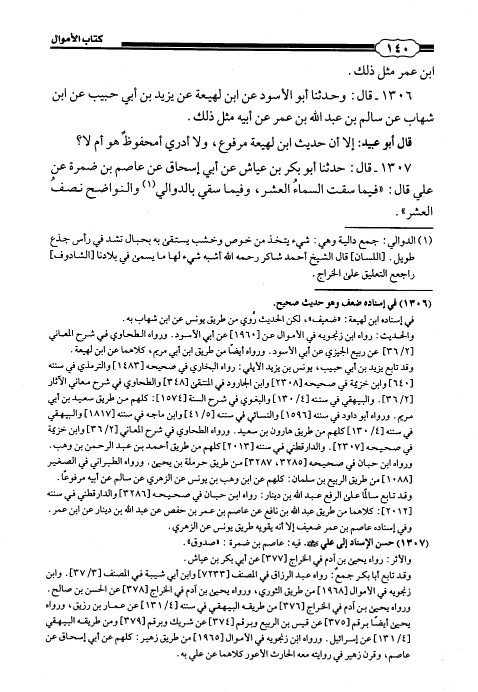 1307 - (1416) قَالَ: حَدَّثَنَا أَبُو بَكْرِ بْنُ عَيَّاشٍ، عَنْ أَبِي إِسْحَاقَ، عَنْ عَاصِمِ بْنِ ضَمْرَةَ، عَنْ عَلِيٍّ، قَالَ: فِيمَا سَقَتِ السَّمَاءُ الْعُشْرُ، وَفِيمَا سُقِيَ بِالدَّوَالِي وَالنَّوَاضِحِ نِصْفُ الْعُشْرِ.