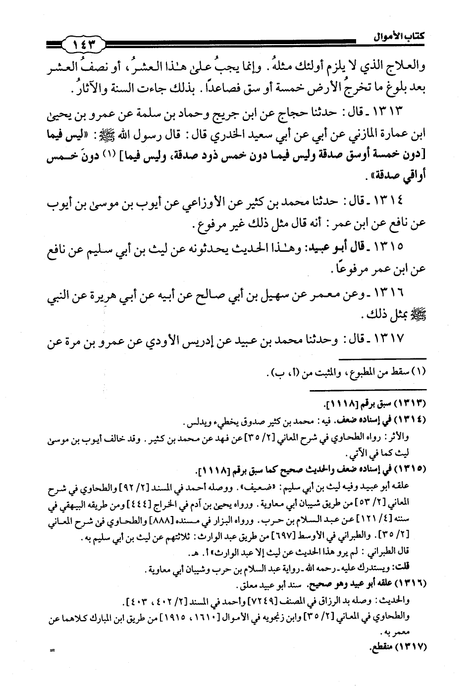 1315 - قَالَ أَبُو عُبَيْدٍ: وَهَذَا الْحَدِيثُ يُحَدِّثُونَهُ عَنْ لَيْثِ بْنِ أَبِي سُلَيْمٍ، عَنْ نَافِعٍ، عَنِ ابْنِ عُمَرَ مَرْفُوعًا.