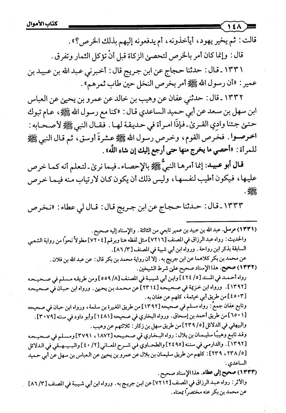 1332 - (1440) قَالَ: حَدَّثَنِي عَفَّانُ، عَنْ وُهَيْبِ بْنِ خَالِدٍ، عَنْ عَمْرِو بْنِ يَحْيَى، عَنِ الْعَبَّاسِ بْنِ سَهْلِ بْنِ سَعْدٍ، عَنْ أَبِي حُمَيْدٍ السَّاعِدِيِّ، قَالَ: كُنَّا مَعَ رَسُولِ اللَّهِ صَلَّى اللهُ عَلَيْهِ وَسَلَّمَ عَامَ تَبُوكَ حَتَّى جِئْنَا وَادِيَ الْقُرَى، فَإِذَا امْرَأَةٌ فِي حَدِيقَةٍ لَهَا، فَقَالَ النَّبِيُّ صَلَّى اللهُ عَلَيْهِ وَسَلَّمَ لِأَصْحَابِهِ: اخْرُصُوا، فَخَرَصَ الْقَوْمُ، وَخَرَصَ رَسُولُ اللَّهِ صَلَّى اللهُ عَلَيْهِ وَسَلَّمَ عَشَرَةَ أَوْسُقٍ، ثُمَّ قَالَ النَّبِيُّ صَلَّى اللهُ عَلَيْهِ وَسَلَّمَ لِلْمَرْأَةِ: أَحْصِي مَا يَخْرُجُ مِنْهَا حَتَّى أَرْجِعَ إِلَيْكِ إِنْ شَاءَ اللَّهُ قَالَ أَبُو عُبَيْدٍ: إِنَّمَا أَمَرَهَا النَّبِيُّ صلى الله عليه وسلم بِالْإِحْصَاءِ فِيمَا نَرَى لِتَعْلَمَ أَنَّهُ كَمَا خَرَصَ عَلَيْهَا، فَيَكُونَ أَطْيَبَ لِنَفْسِهَا، وَلَيْسَ ذَلِكَ أَنْ يَكُونَ كَانَ لِارْتِيَابٍ مِنْهُ فِيمَا خَرَصَ صَلَّى اللهُ عَلَيْهِ وَسَلَّمَ.