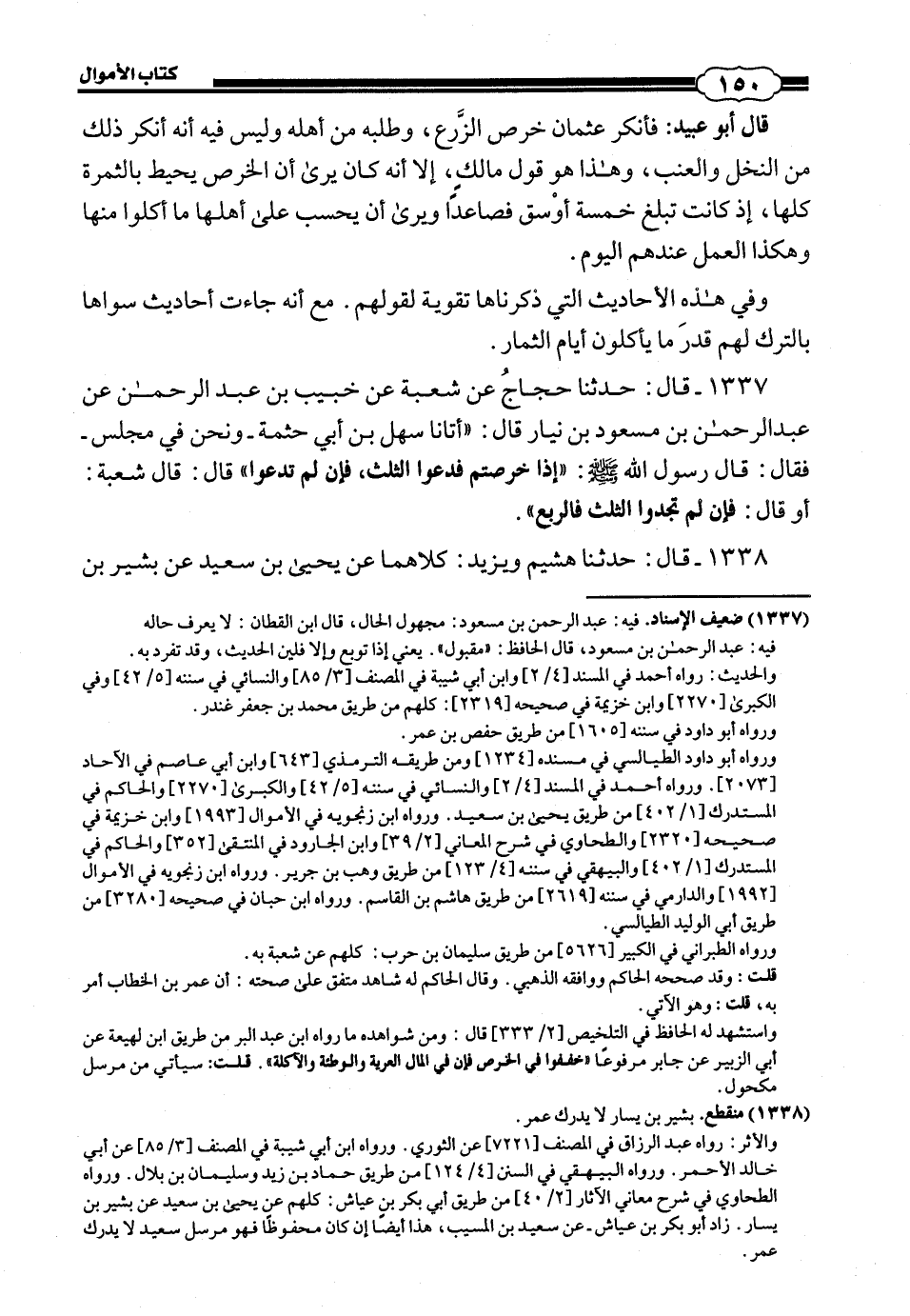 1337 - (1448) قَالَ: حَدَّثَنَا حَجَّاجٌ، عَنْ شُعْبَةَ، عَنْ حَبِيبِ بْنِ عَبْدِ الرَّحْمَنِ، عَنْ عَبْدِ الرَّحْمَنِ بْنِ مَسْعُودِ بْنِ نِيَارٍ، قَالَ: أَتَانَا سَهْلُ بْنُ أَبِي حَثْمَةَ وَنَحْنُ فِي مَجْلِسٍ، فَقَالَ: قَالَ رَسُولُ اللَّهِ صَلَّى اللهُ عَلَيْهِ وَسَلَّمَ: إِذَا خَرَصْتُمْ فَدَعُوا الثُّلُثَ، فَإِنْ لَمْ تَدَعُوا - قَالَ: قَالَ شُعْبَةُ: أَوْ قَالَ: فَإِنْ لَمْ تَجِدُوا - الثُّلُثَ فَالرُّبُعَ.