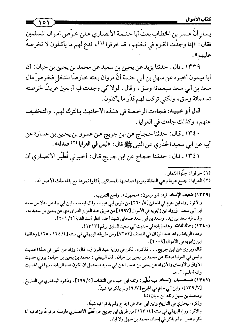 1339 - (1450) قَالَ: حَدَّثَنَا يَزِيدُ، عَنْ يَحْيَى بْنِ سَعِيدٍ، عَنْ مُحَمَّدِ بْنِ يَحْيَى بْنِ حَبَّانَ، أَنَّ أَبَا مَيْمُونٍ أَخْبَرَهُ، عَنْ سَهْلِ بْنِ أَبِي حَثْمَةَ، أَنَّ مَرْوَانَ بَعَثَهُ خَارِصًا لِلنَّخْلِ، فَخَرَصَ مَالَ سَعْدِ بْنِ أَبِي سَعْدٍ سَبْعَمِائَةِ وَسْقٍ، وَقَالَ: «لَوْلَا أَنِّي وَجَدْتُ فِيهِ أَرْبَعِينَ عَرِيشًا لَخَرْصُتُهُ تِسْعَمِائَةِ وَسْقٍ، وَلَكِنِّي تَرَكْتُ لَهُمْ قَدْرَ مَا يَاكُلُونَ» قَالَ أَبُو عُبَيْدٍ: فَجَاءَتِ الرُّخْصَةُ فِي هَذِهِ الْأَحَادِيثِ بِالتَّرْكِ لَهُمْ، وَالتَّخْفِيفِ عَنْهُمْ، وَكَذَلِكَ جَاءَتْ فِي الْعَرَايَا.