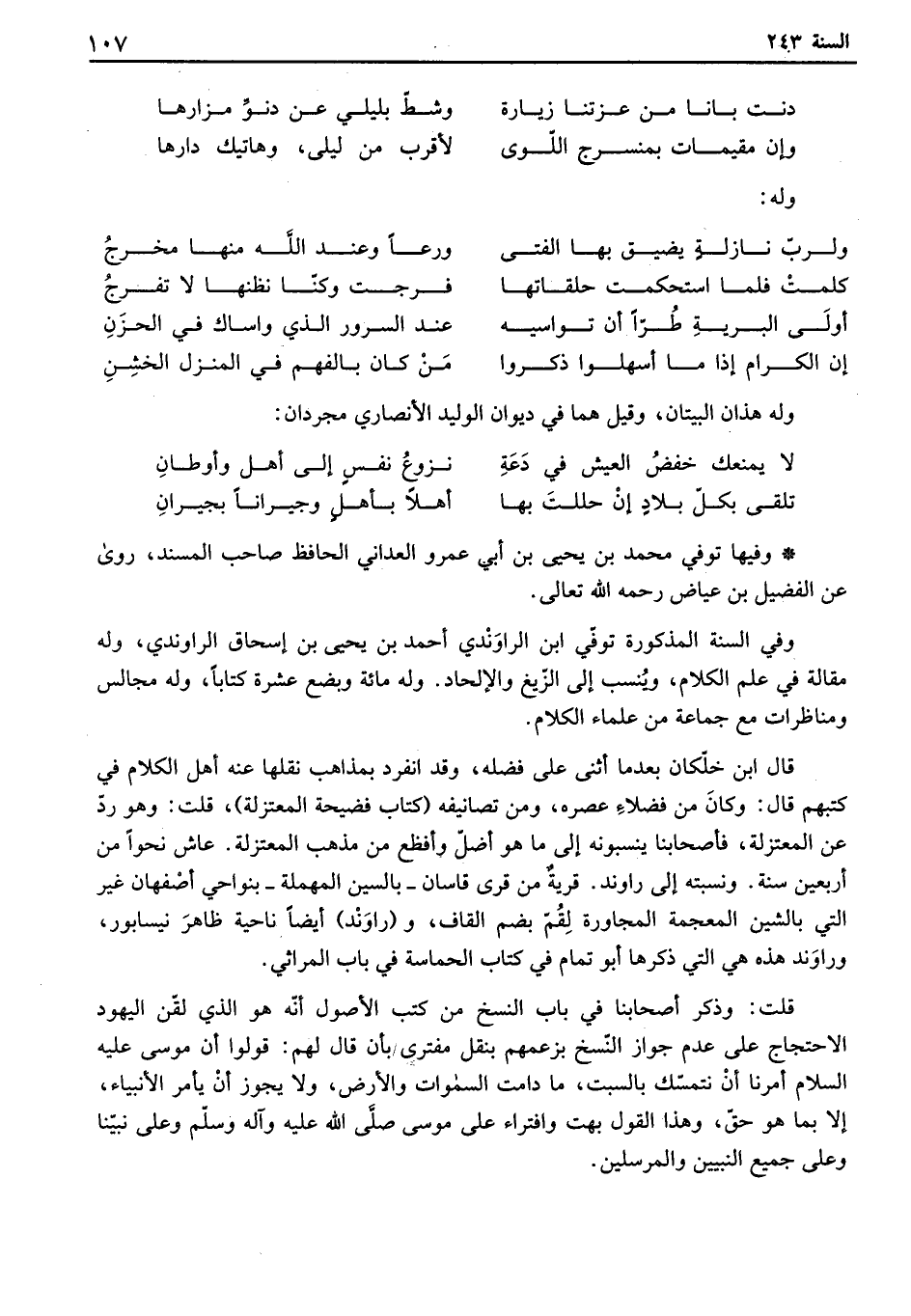 وفي السنة المذكورة توفي ابن الراوندي أحمد بن يحيى بن إسحاق الراوندي، وله مقالة في علم الكلام، وينسب إلى الزيغ والإلحاد. وله مائة وبضع عشرة كتاباً، وله مجالس ومناظرات مع جماعة من علماء الكلام.