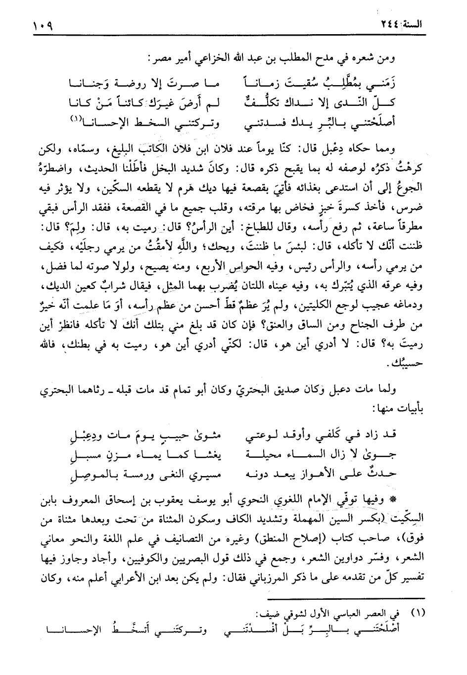 وفيها توفي الإمام اللغوي النحوي أبو يوسف يعقوب بن إسحاق المعروف بابن السكيت " بكسر السين المهملة وتشديد الكاف وسكون المثناة من تحت وبعدها مثناة فوق "، صاحب كتاب " إصلاح المنطق " وغيره من التصانيف في علم اللغة والنحو معاني الشعر، وفسر دواوين الشعر، وجمع في ذلك قول البصريين والكوفيين، وأجاد وجاوز فيها تفسير كل من تقدمه على ما ذكر المرزباني فقال: ولم يكن بعد ابن الأعرابي أعلم منه، وكان
